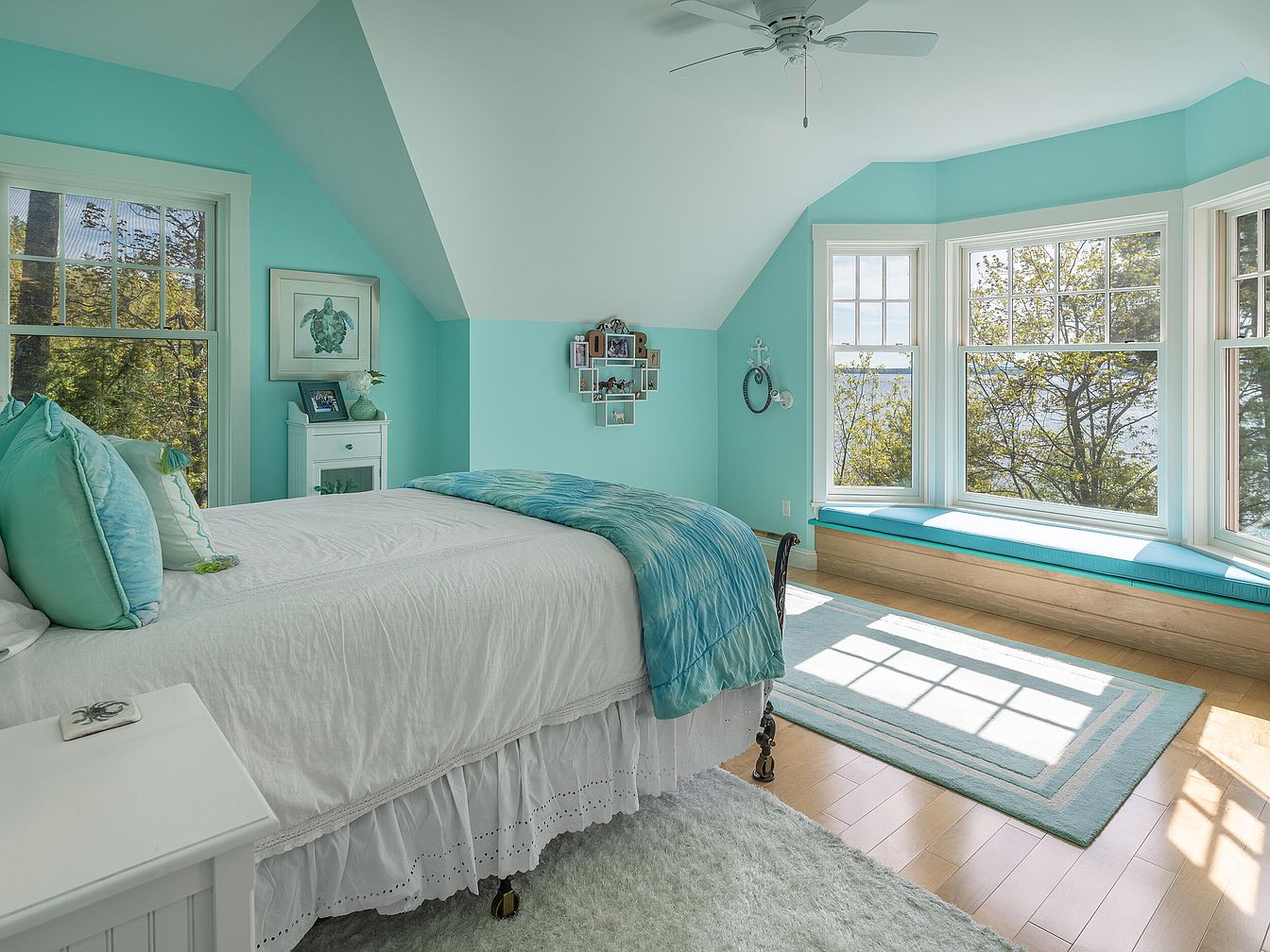 This serene bedroom embraces a coastal-inspired aesthetic with soft aqua walls complementing crisp white window frames and ceiling. A large bay window features a built-in bench seat with matching aqua cushions, allowing natural light and views of the surrounding greenery to fill the room. The bed is dressed in white linens and adorned with blue-green throw pillows and a coordinating throw blanket. The hardwood floor contrasts warmly against the light hues, softened by a plush white area rug and an aqua-bordered rectangular rug. Simple, delicate furniture pieces and tasteful décor, such as a turtle art piece and small shelf, create a restful, airy atmosphere perfect for relaxation.