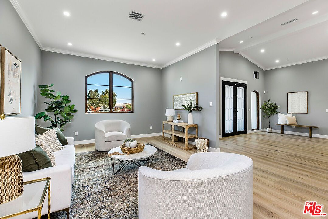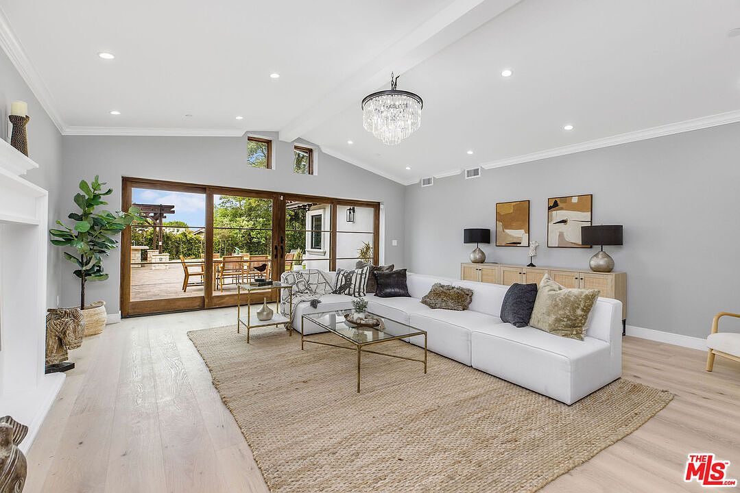 This spacious living room features soft gray walls paired with light wood flooring, creating an airy and serene atmosphere. A large white sectional sofa anchors the space, adorned with textured throw pillows in earthy tones. The room is centered around a low-profile glass coffee table with a gold metal frame, positioned on a natural woven rug that adds warmth and tactile contrast. Floor-to-ceiling sliding wooden doors open to an outdoor patio, inviting natural light and greenery inside. Modern accents include two abstract artworks above a minimalist wooden credenza topped with matching black-shaded lamps, and a statement crystal chandelier hanging from the vaulted ceiling enhances the room’s elegant, contemporary vibe.
