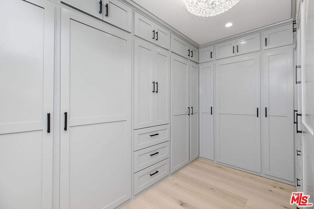 This spacious walk-in closet features floor-to-ceiling cabinetry painted in a soft, muted gray that creates a calm and organized atmosphere. The closet is designed with a combination of large paneled doors, drawers, and upper cabinets, all accented with sleek black metal handles for a modern touch. The warm, light wood flooring softens the look while providing a natural contrast to the cabinetry. Recessed lighting in the ceiling brightens the space, complemented by a decorative, round chandelier adding subtle elegance. The clean lines and thoughtful layout maximize storage efficiency and style in this functional dressing area.