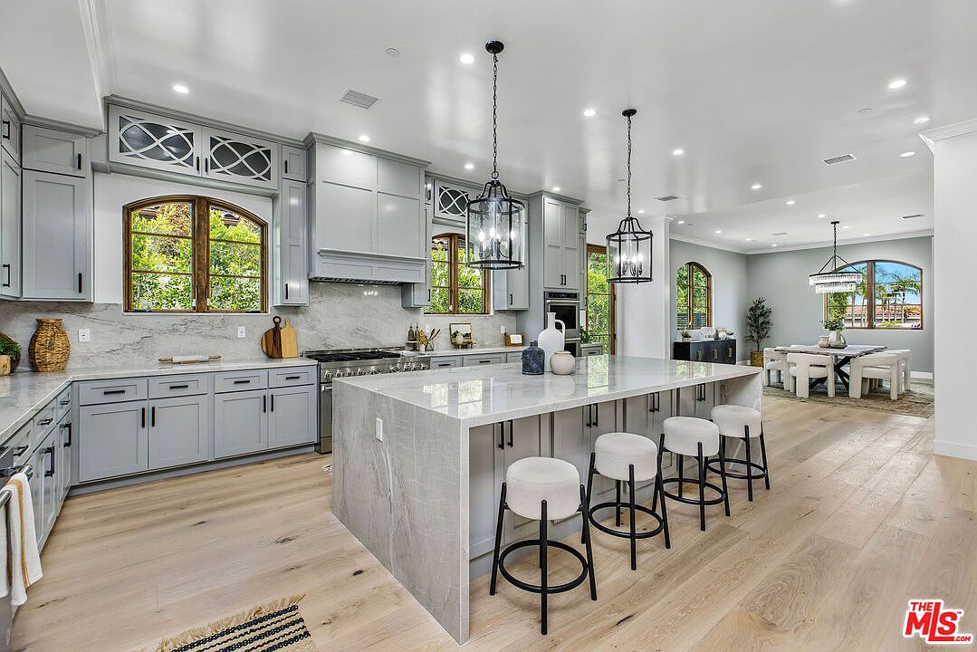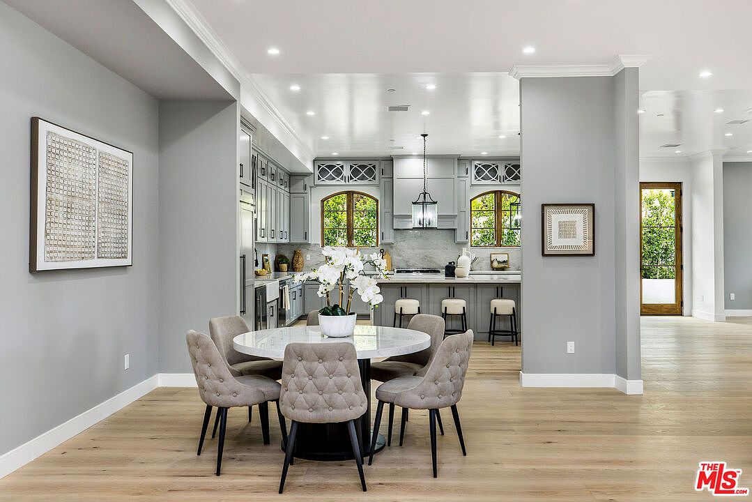 This space combines a cozy dining area with an open-concept kitchen, highlighting a seamless flow for entertaining and daily living. The dining area features a round marble-top table surrounded by six taupe tufted chairs with dark legs, creating an inviting setting. Soft gray walls complement the light oak wood flooring that runs throughout, enhancing the room’s airy feel. The kitchen boasts classic gray cabinetry with glass-front upper cabinets and black hardware, while dual arched windows framed in rich wood bring in natural light. A large island hosts three cushioned stools and a stylish lantern pendant light, blending comfort with elegant design.