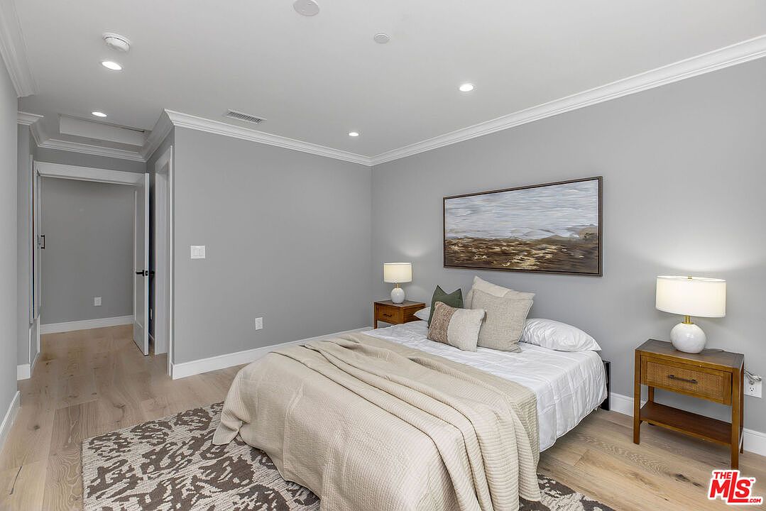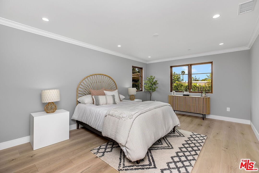 This serene bedroom features a soft gray palette complemented by light oak hardwood floors that add warmth to the space. The bed is the focal point, framed by a distinctive rattan headboard that introduces texture and a natural element. Crisp white linens with subtle patterns on pillows and a cozy throw enhance the inviting ambiance. Minimalist white nightstands with matching wicker lamps anchor either side of the bed. A geometric patterned area rug underfoot adds character without overpowering the simplicity. Natural light flows through dual wooden-framed windows, highlighting a sleek slatted wood console topped with decorative accents and a potted plant in the corner. The room’s recessed lighting and crown molding complete the modern yet comfortable aesthetic.