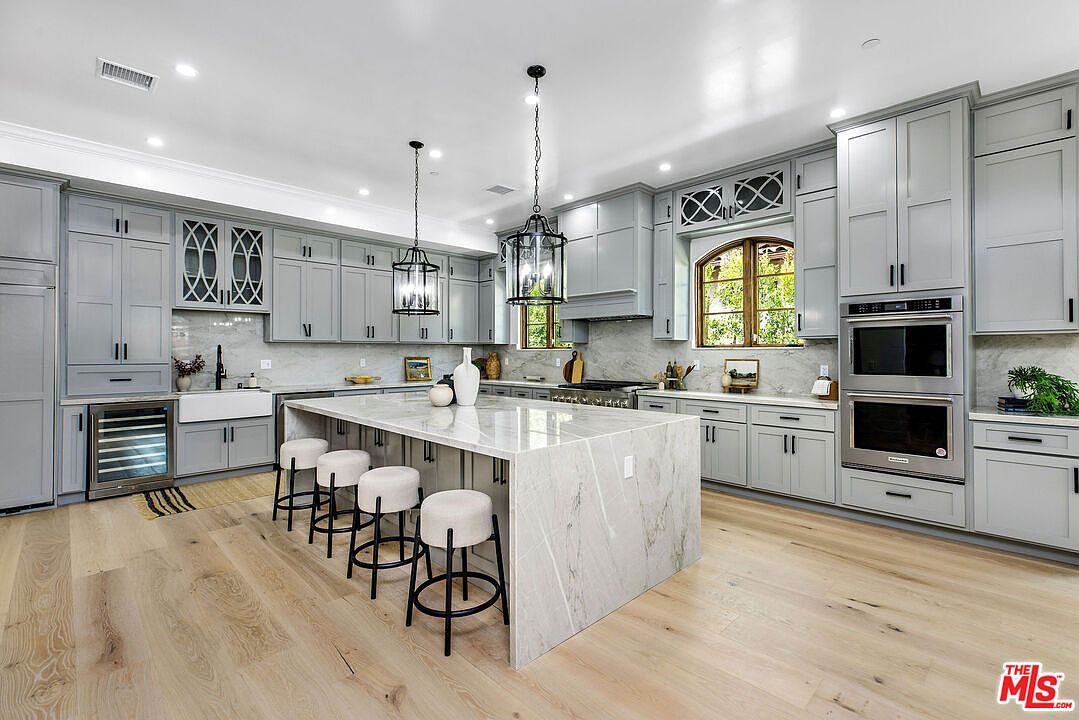 This kitchen features a large island with a sleek marble countertop that extends to the sides, providing ample workspace and seating for four with round, cushioned stools that have black metal legs. The cabinetry is painted a soft gray with black hardware, giving a modern yet classic aesthetic. Two large black-framed pendant lights hang above the island, adding visual interest and warm illumination. Light wood flooring extends throughout, complementing the white marble backsplash and countertop. A large farmhouse sink and double wall oven are integrated seamlessly, while a window with wooden trim allows natural light to brighten the space.