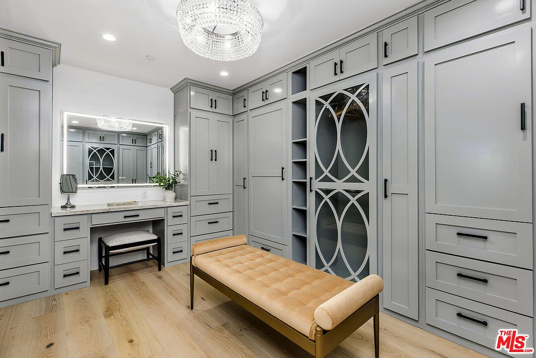 This spacious walk-in closet features a cohesive design with tall, light gray cabinetry extending to the ceiling, providing abundant storage with a mix of drawers, cupboards, and open shelving. The cabinetry incorporates sleek black hardware for a modern contrast. A built-in vanity area is highlighted by an illuminated mirror bordered with soft white lighting, perfect for makeup or grooming. The floor showcases warm, light wood planks, creating a natural, inviting atmosphere. A plush, tufted bench in a muted camel tone with metal legs sits in the center, adding comfort and style. Overhead, a delicate crystal chandelier adds an elegant touch, blending luxury with functionality in this serene dressing space.