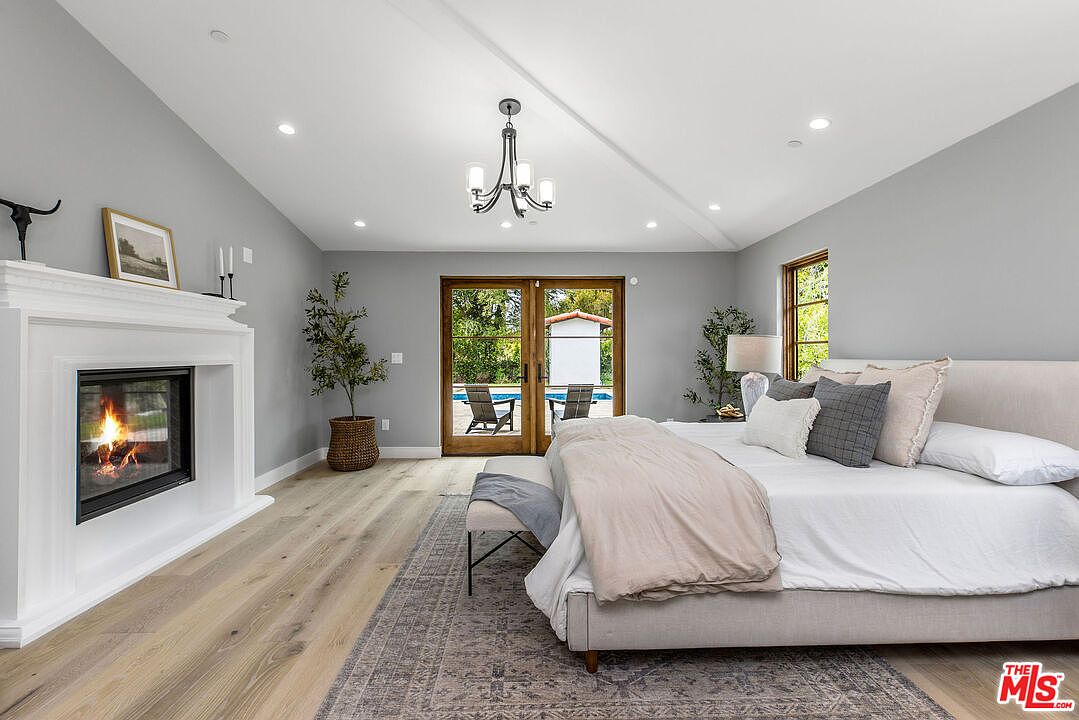 This spacious master bedroom offers a serene and airy atmosphere with soft gray walls complemented by natural light flowing through wood-framed glass doors and windows. The room features a plush, neutral-toned bed with an assortment of pillows, sitting atop a subtle, vintage-style area rug that adds texture without overwhelming the simplicity of the space. Adjacent is a cozy white fireplace that introduces warmth and elegance via its traditional mantel, adorned minimally with art and candles. Clean lines, recessed lighting, and a modern chandelier enhance the room’s sophisticated yet inviting aesthetic while greenery in woven baskets adds a touch of nature.