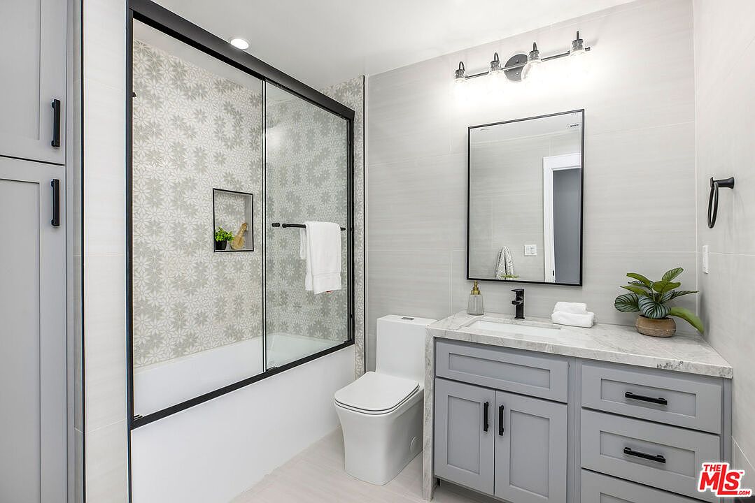 The bathroom features a clean, modern aesthetic with a soft and neutral color palette dominated by light gray and white tones. The vanity is painted in a muted gray with a marble countertop adding subtle elegance. Black hardware on the cabinetry and fixtures creates a sophisticated contrast. A large rectangular mirror framed in black hangs above the sink, flanked by a set of three lights with exposed bulbs for bright illumination. The tub area is enclosed with sliding glass doors framed in black, and the shower wall showcases patterned tiles in a soft floral motif. Functional touches include a built-in niche holding small decorative items and a towel bar for easy access, blending practicality with style. The overall layout is efficient, maximizing space without feeling cramped.