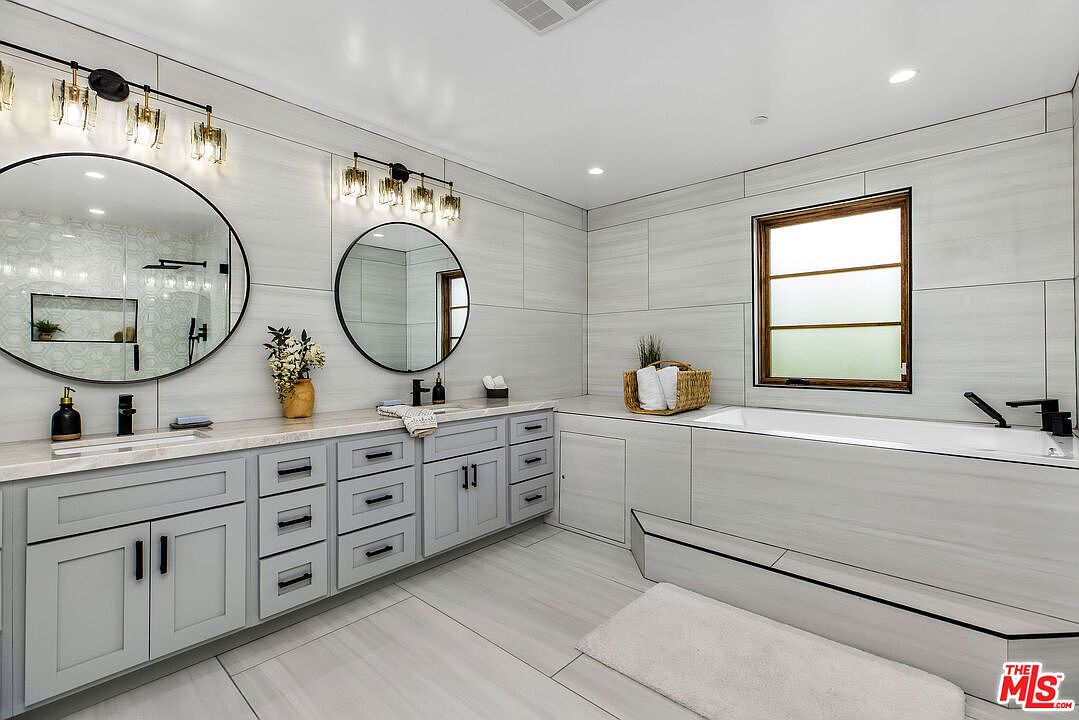 This spacious bathroom features a modern, sleek design with a neutral color palette of soft grays and whites. The vanity area includes two round, black-framed mirrors positioned above a wide marble countertop with twin sinks. Light gray cabinetry beneath provides ample storage, featuring matte black hardware for a contemporary touch. Above the mirrors, stylish industrial-style glass light fixtures add warmth to the space. On the right, a large built-in bathtub is surrounded by matching tile with a single step for easy access. A frosted window above the tub lets in natural light while maintaining privacy. The overall aesthetic is clean, elegant, and functional.