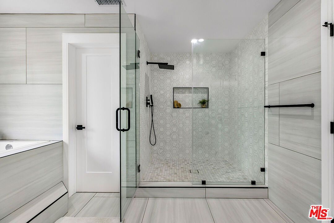 This bathroom features a spacious walk-in shower enclosed by clear glass panels with sleek black hardware accents. The floor and walls are clad in light-toned tiles with a subtle striped pattern that harmonizes with the intricate hexagonal mosaic tile design inside the shower area. A recessed niche within the shower wall provides practical storage with decorative elements like plants placed inside for organic warmth. The black rainfall showerhead and handheld fixture contrast elegantly with the neutral palette. Adjacent to the shower is a large bathtub area matching the same light tile finish, while matte black towel bars and door handles add a contemporary touch.