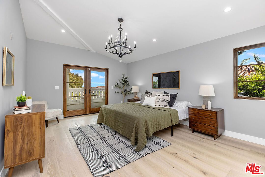 This spacious master bedroom features a serene and airy ambiance with light gray walls enhancing natural light from large wood-framed French doors and a side window, providing views of the garden and tiled roof outside. The room is elegantly furnished with a mid-century modern wooden dresser and matching bedside tables, flanked by minimalist lamps. A plush olive-green bedspread contrasts nicely against a geometric black and white rug centered beneath the bed. The vaulted ceiling highlights a wrought iron chandelier, adding a touch of classic sophistication that complements the clean, modern aesthetics throughout the space.