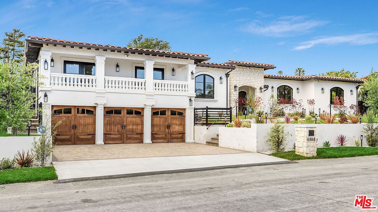 This elegant front exterior presents a Mediterranean-style home characterized by white stucco walls and a low-pitched roof with traditional terracotta tiles. The façade is enhanced with classical architectural elements, such as the white columns and balustrades above the expansive three-car garage with warm wooden doors featuring black hardware. The entryway is distinguished by an arched stone accent wall and a wrought iron railing along the elevated pathway and stairs, creating a welcoming and stately entrance. The landscaping includes a variety of low-maintenance greenery and accent plants, framed by a clean, modern white retaining wall with a built-in mailbox pillar, contributing to a balanced and inviting curb appeal under a bright blue sky.