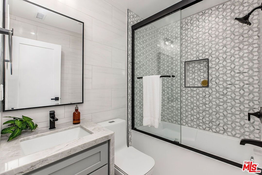 This bathroom features a sleek and contemporary design highlighting a seamless blend of neutral tones and geometric patterns. The light gray vanity with a marble countertop houses a rectangular undermount sink paired with a matte black faucet. A large, simple black-framed mirror above enhances the space’s brightness. The bathtub is enclosed with clear glass framed in black, complementing the bold shower fixtures. The back wall of the tub area showcases an eye-catching, patterned tile design in gray and white tones, creating a sophisticated focal point. A white towel hangs neatly on the black towel bar, adding to the clean, minimalist feel. The overall atmosphere is fresh, elegant, and thoughtfully balanced between light surfaces and striking dark accents.