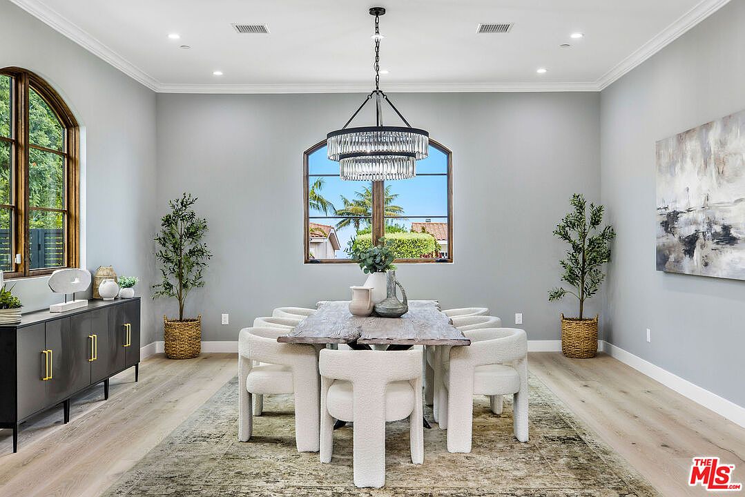 This spacious dining room features a rustic wooden table surrounded by eight plush, white upholstered chairs with modern curved backs. Soft grey walls complement the natural wood flooring, enhancing the room’s airy, serene feel. Two tall potted plants in woven baskets add a touch of greenery to the corners. A sleek black sideboard with gold handles lines one wall, adorned with subtle decorative pieces. The arched windows with rich wood trim provide natural light and a view of palm trees and rooftops. A striking two-tier crystal chandelier hangs above the table, blending elegance with the room’s contemporary aesthetic.
