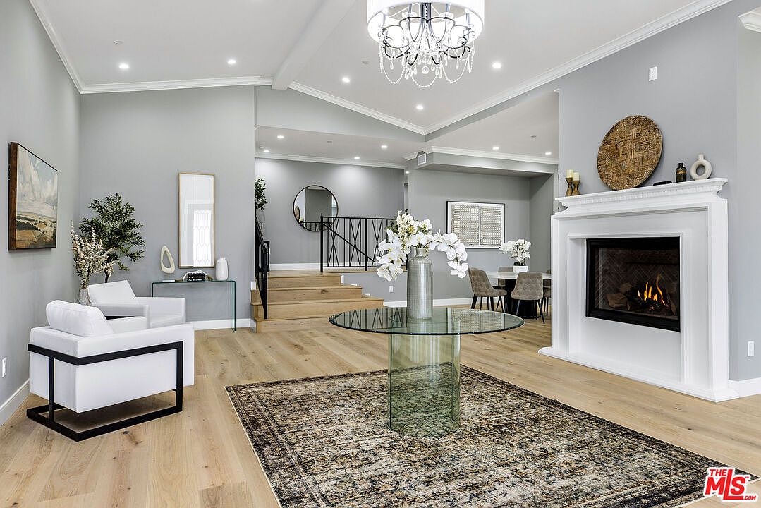 This spacious living area features a sophisticated palette of soft gray walls paired with light oak wood flooring, creating a serene and elegant atmosphere. The room centers around a modern glass round coffee table set on a richly textured oriental-style rug, adding visual warmth. A sleek white armchair with angular black metal framing provides a minimalist yet comfortable seating option. The white fireplace mantel is a classic focal point, topped with tasteful decorative items including a large woven piece, candles, and sculptural accents. A chandelier with crystal embellishments further enhances the room’s refined ambiance, while recessed lighting ensures smooth illumination. Architectural details include crown molding and a slightly vaulted ceiling, with a small staircase leading to an adjacent dining space, seamlessly integrating open-concept living with subtle zoning.