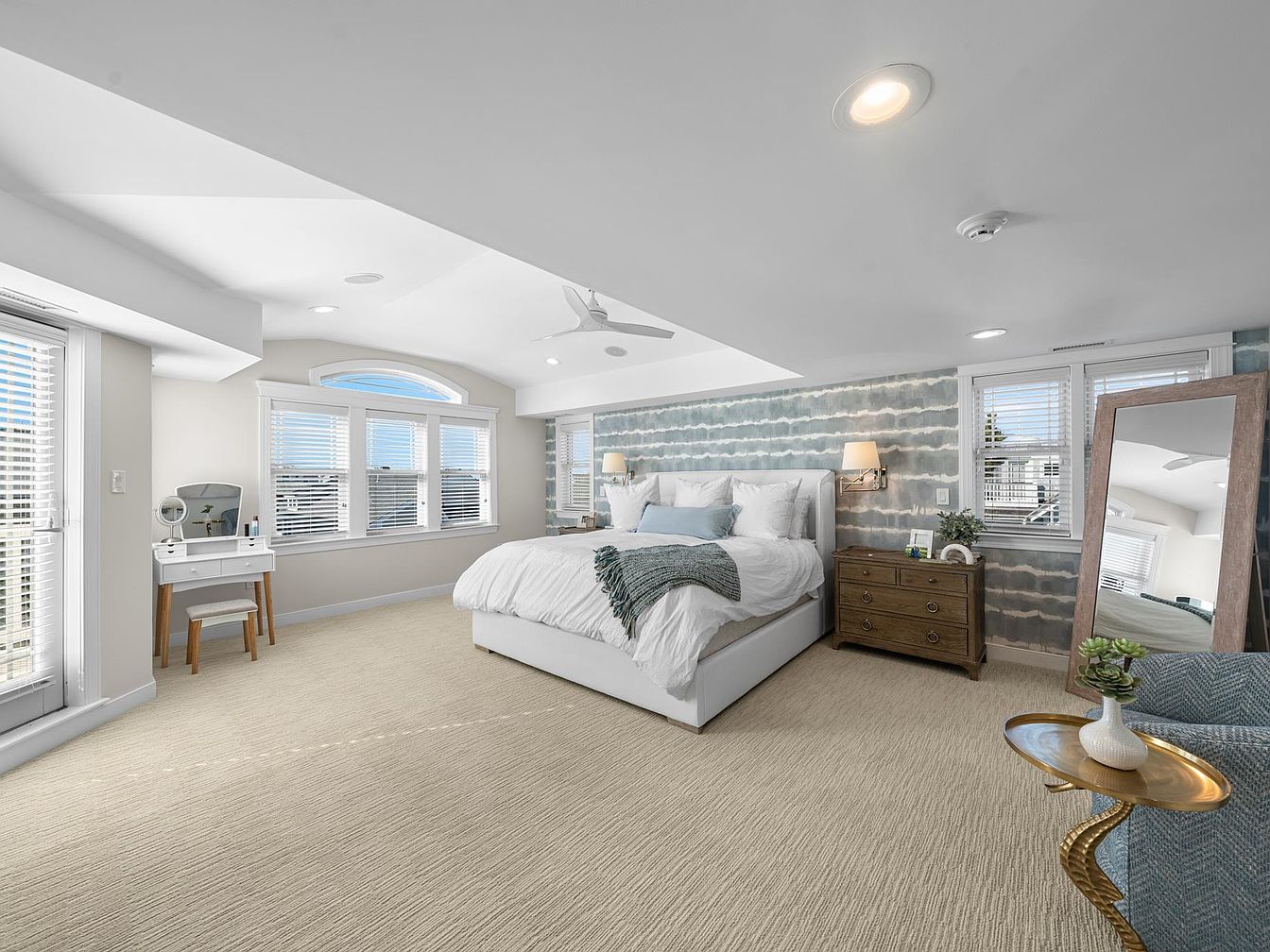 This master bedroom exudes an airy and tranquil vibe, featuring a spacious layout with a plush light beige carpet anchoring the room. A large bed with a crisp white headboard and linens stands against a distinctive accent wall adorned with a subtle blue and gray striped pattern that adds calm and texture. Flanking the bed, classic wooden nightstands with warm brown tones hold modern wall lamps. Natural light floods in from multiple windows, including a unique arched window above the bed and white-shuttered windows on either side, creating a bright and peaceful atmosphere. A simple white vanity with a round mirror sits near a glass door to the left, and a full-length mirror leans against the wall beside a cozy blue armchair paired with an elegant gold side table, combining function with sophisticated comfort.