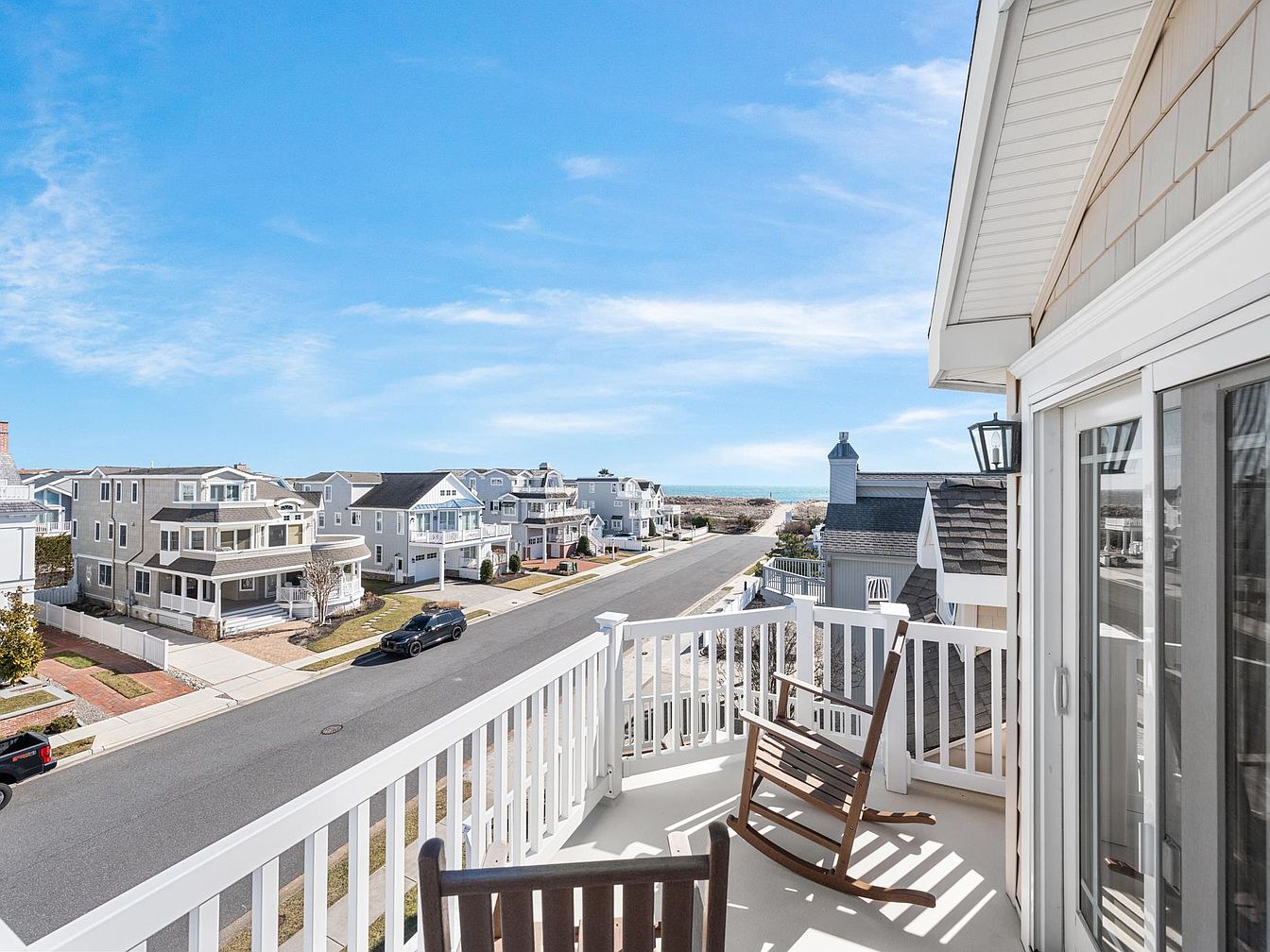 This serene balcony offers a charming vantage point with white wooden railings complementing the soft beige siding of the house. Two wooden rocking chairs create an inviting spot to relax and enjoy the peaceful street below. The neighborhood features well-maintained homes with muted, coastal-inspired color palettes dominated by whites and light grays. The street leads unobstructed toward a sandy beach and the blue ocean beyond, framed by a clear, expansive sky. This outdoor space blends comfort and coastal living, exemplifying a tranquil retreat perfect for morning coffee or sunset views by the shore.