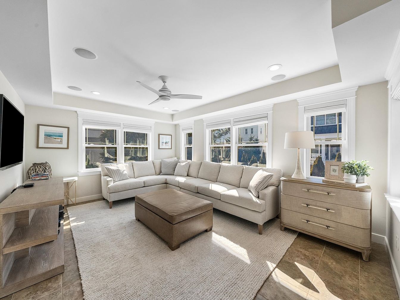 This bright and inviting living space features a large L-shaped beige sectional sofa centered around a plush brown ottoman, creating a perfect gathering spot for relaxation and conversation. The room is bathed in natural light from the multiple windows framed with classic white trim, enhancing the soft neutral color palette. The ceiling boasts recessed lighting and a modern white ceiling fan, adding both function and subtle style. A textured area rug anchors the space, while a light-wood media console and a matching dresser with a lamp and plant provide warm and natural accents, blending comfort with understated elegance.