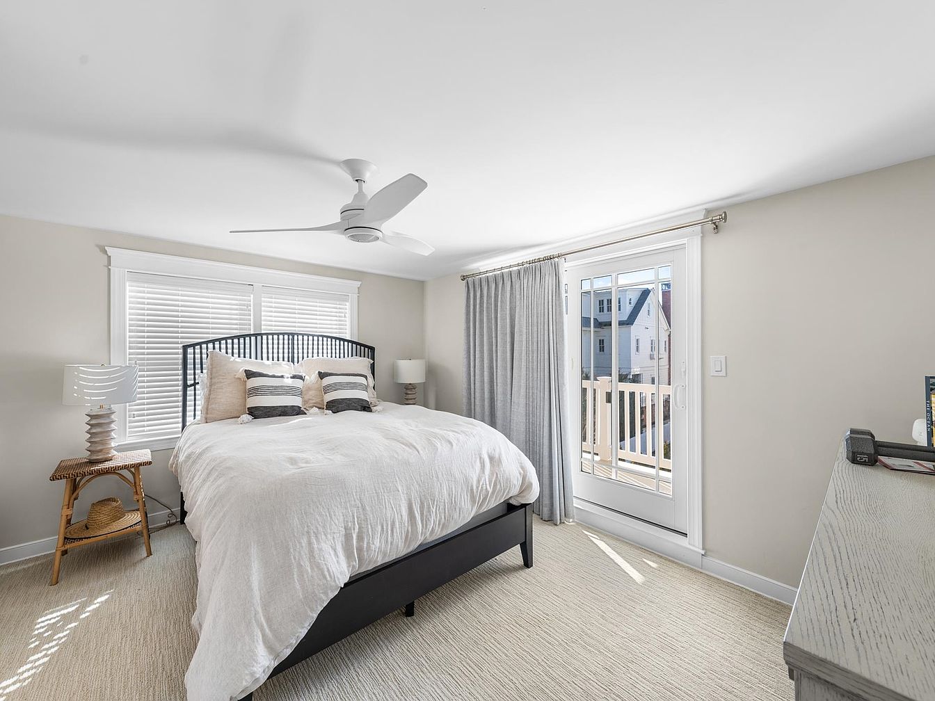 This serene bedroom features a neutral palette with soft beige walls and a light-toned textured carpet, enhancing natural light from the window and glass door leading to a small balcony. The bed showcases a simple black metal frame paired with crisp white bedding and decorative throw pillows in neutral tones with subtle black stripes, creating a cozy and inviting space. On one side, a wicker nightstand complements the room’s understated elegance, topped with a sculptural lamp. A modern white ceiling fan provides circulation, while long grey curtains frame the balcony doors, adding softness to the clean-lined architectural details.