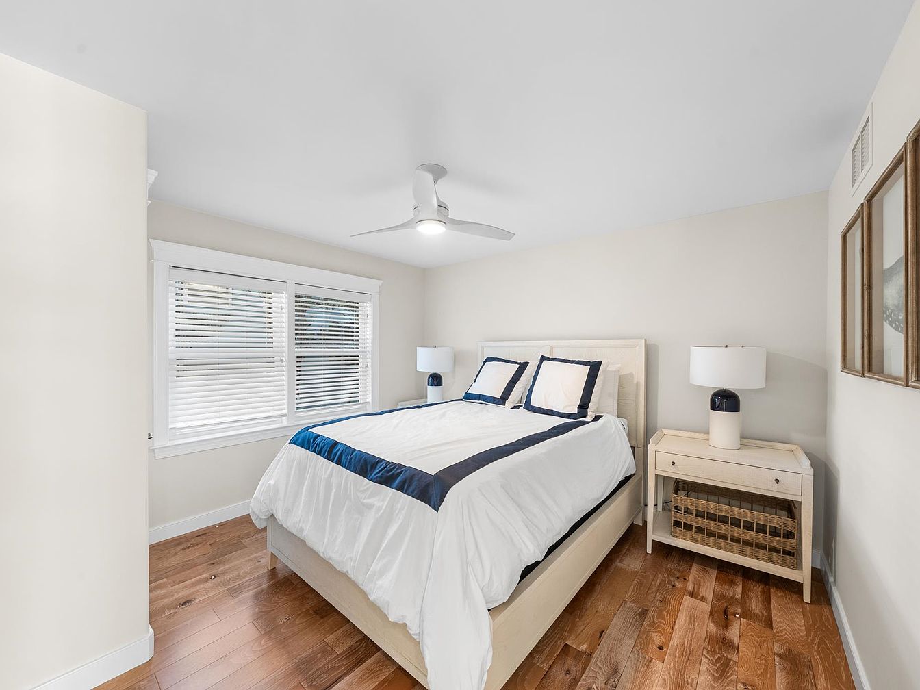 This serene master bedroom features a clean and inviting design with soft beige walls and white trim that brighten the space. A plush, upholstered bed dressed in crisp white linens anchors the room, flanked by natural wood nightstands topped with woven, cane-style lamps that add texture and warmth. The hardwood flooring complements the soft color palette, while a neutral woven area rug underfoot enhances comfort. White plantation blinds cover the window, balancing light and privacy. Modern touches include a sleek white ceiling fan and botanical artwork, creating a calm, fresh atmosphere ideal for rest and relaxation.