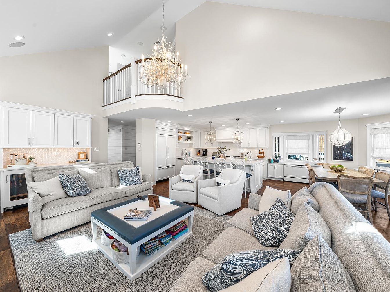 This expansive living area features a seamless flow into the adjoining kitchen and dining space, highlighted by vaulted ceilings and soft natural light pouring through multiple windows, including a striking round window above. The color palette favors a sophisticated neutral scheme with white walls, light beige upholstery, and subtle blues in accent pillows and the coffee table edging, creating a coastal yet elegant ambiance. Rich hardwood floors anchor the space and contrast with the light tones of the furniture. The kitchen island, with white cabinetry and pendant lighting, serves as a social hub, while the dining area’s wood furniture balances modernity with a welcoming, comfortable atmosphere.