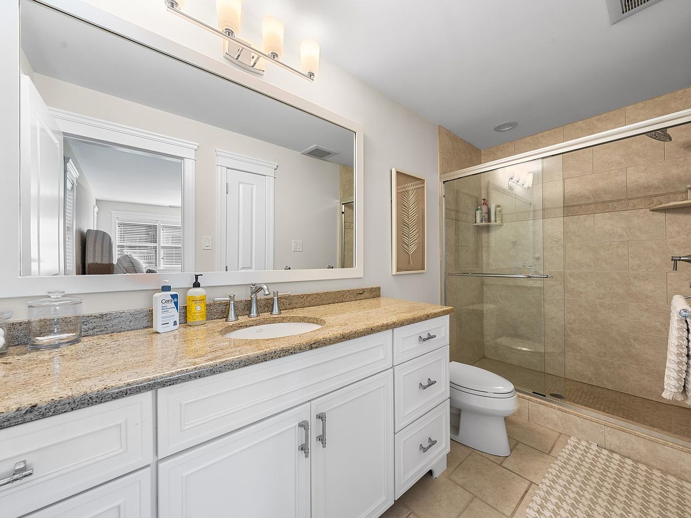 This bathroom features a spacious white vanity with classic cabinetry and a beige granite countertop that adds warmth and texture to the space. A wide mirror above the sink is framed in white, complementing the cabinetry and creating a sense of openness. Sleek silver fixtures enhance the sink’s functionality and style. The shower area is enclosed with clear glass sliding doors, showcasing large beige tiles with subtle decorative accents. Neutral tones dominate the color scheme, with the light tile floor and tasteful artwork contributing to a calm, clean, and inviting atmosphere.