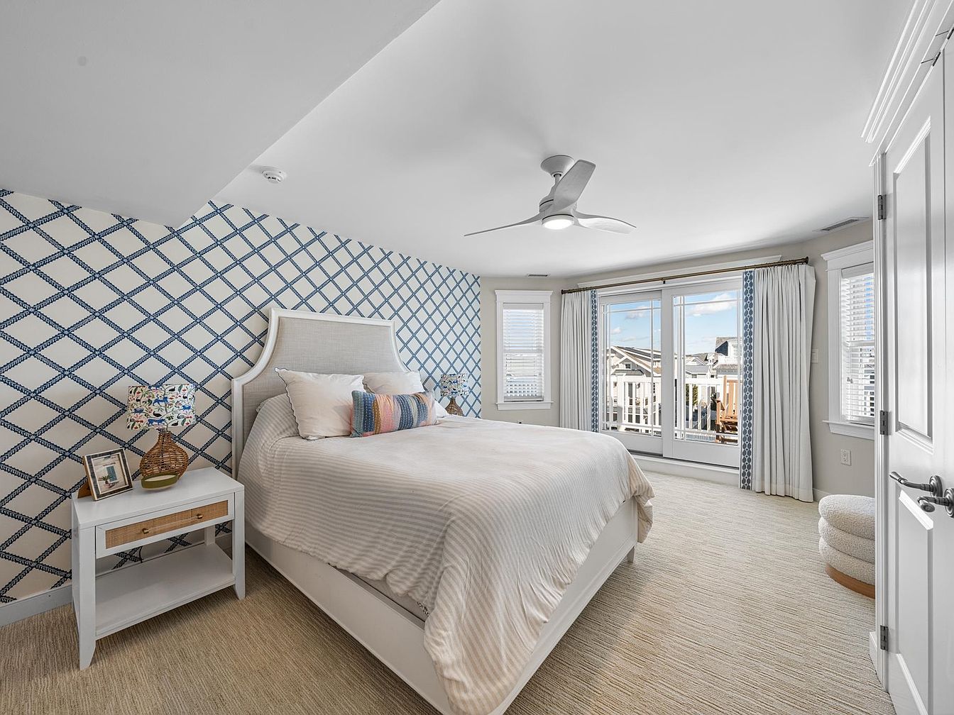 This bedroom features a calming, neutral palette with beige carpeting and white trim throughout. A white upholstered bed with a gently curved headboard anchors the room, dressed in soft, striped bedding and accented with multicolored and neutral pillows. One wall is adorned with a geometric blue lattice-patterned wallpaper, adding visual interest behind the bed. Matching nightstands flank each side, topped with woven base lampshades and decorative items. Large glass doors open onto a balcony, framed by creamy-white curtains with subtle blue detailing. The ceiling fan placement offers both function and a modern touch to this serene, sunlit retreat.