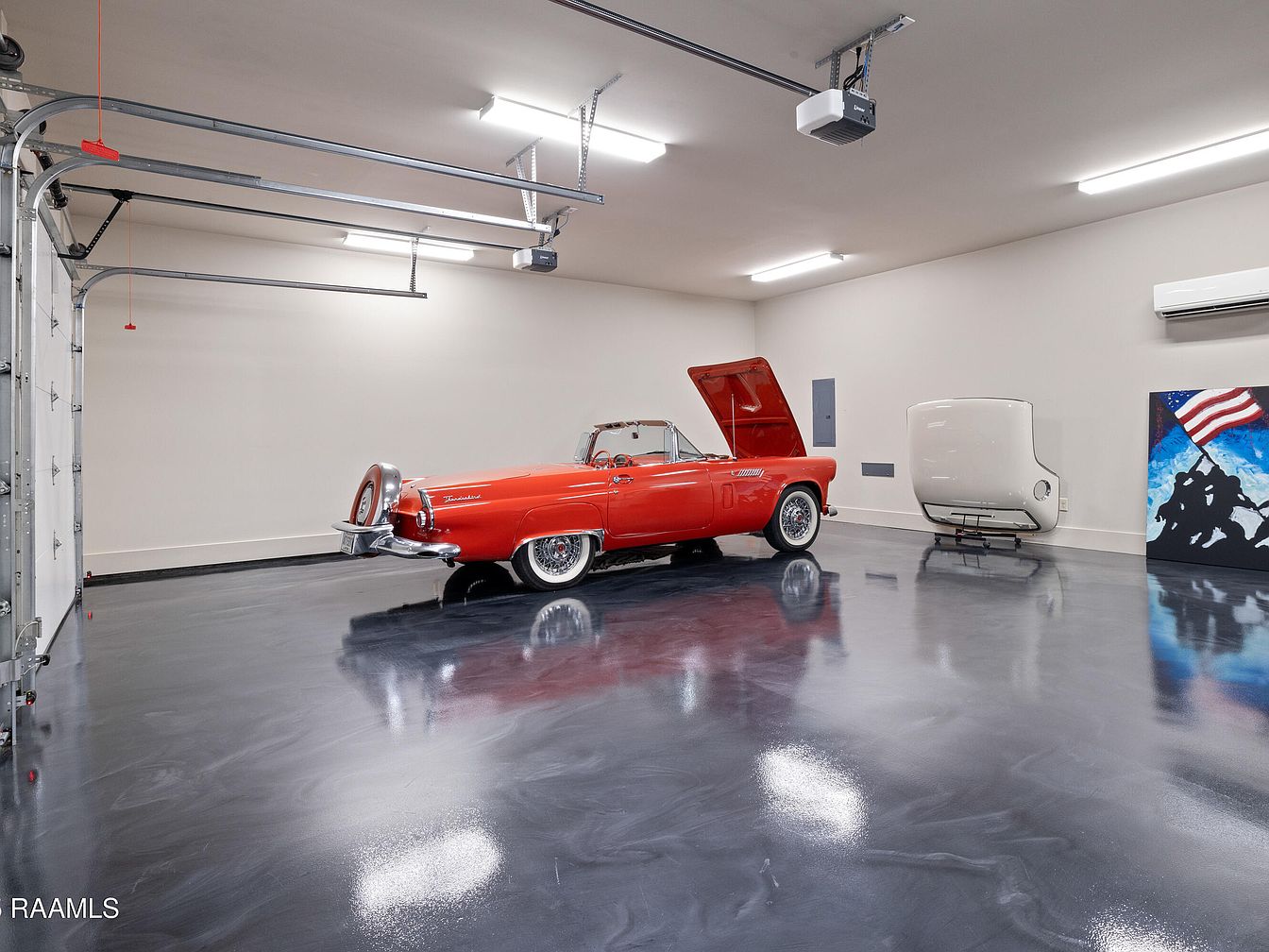 This spacious garage features a high-gloss, polished epoxy floor in charcoal tones that reflects light beautifully, creating a sleek and clean environment. The walls are painted a soft, neutral beige, enhancing the bright and airy feel provided by multiple overhead fluorescent fixtures. Showcased prominently is a vibrant red classic convertible car with its hood open, adding a striking vintage touch to the modern, minimalistic setting. A car hood and a patriotic artwork lean against one wall, contributing a personalized, curated décor element. Functional ceiling-mounted garage door tracks and an air conditioning unit complete this practical yet stylish space.