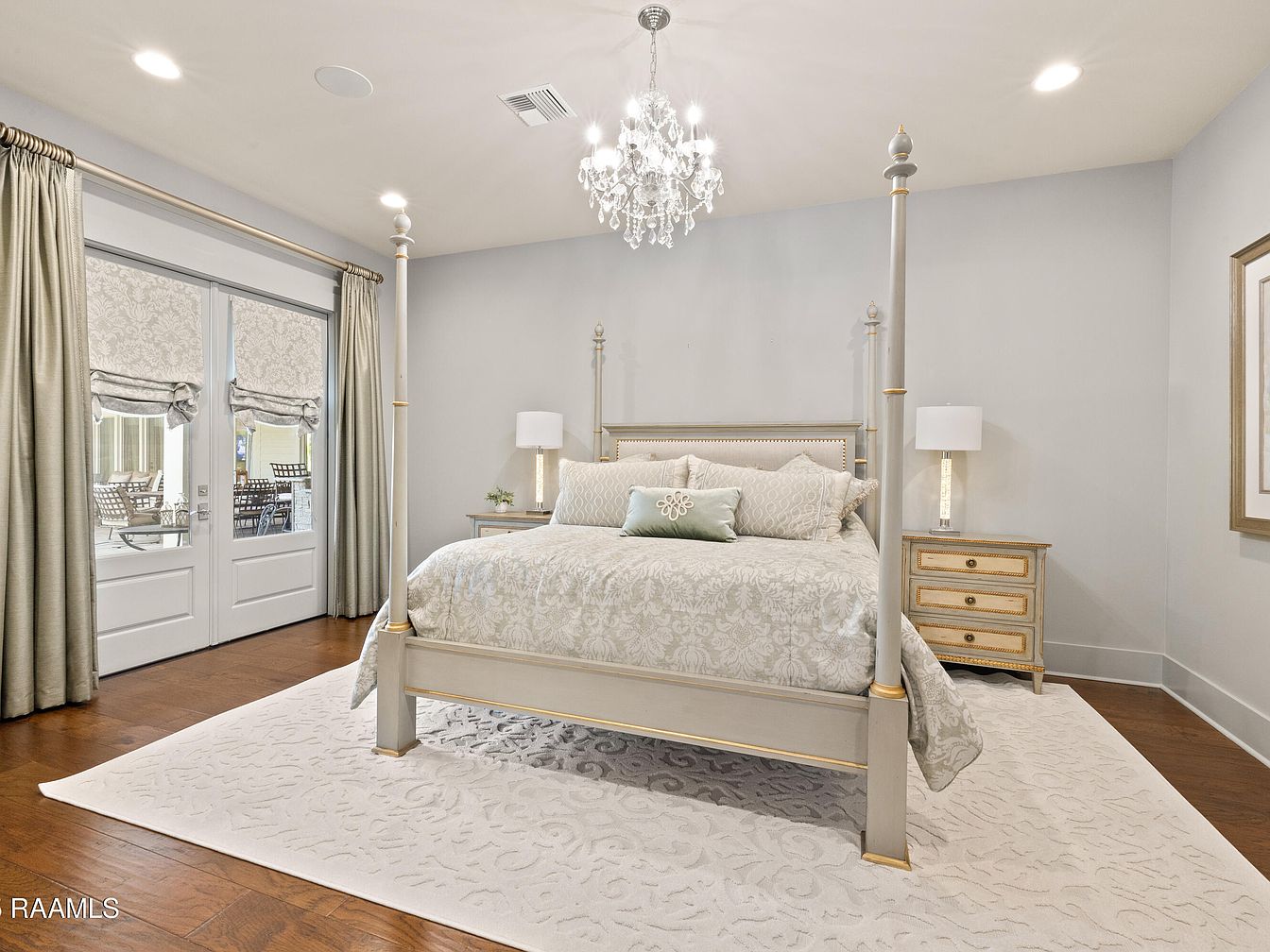 This serene master bedroom features a classic, four-poster bed with subtle gold accents, dressed in a matching damask-patterned comforter and an assortment of pillows in soft neutral tones. The walls are painted a gentle gray, complementing the elegant white and gold nightstands flanking each side of the bed, each topped with a contemporary lamp that adds warm light. Floor-length curtains frame French doors that open to an outdoor seating area, inviting natural light into the space. A large, plush white area rug with a delicate textured pattern anchors the room, while a crystal chandelier serves as a sophisticated focal point, enhancing the refined and tranquil atmosphere.