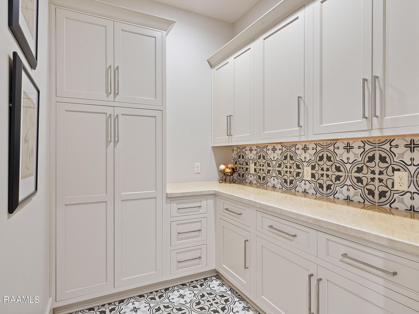 This compact pantry area features abundant white cabinetry with recessed panel doors and sleek silver handles, offering ample storage both above and below the countertop. The L-shaped cream-colored counter presents a smooth, polished surface perfect for food prep or organizing items. Bold black-and-white patterned tiles adorn both the floor and backsplash, providing a striking contrast and adding visual interest to the otherwise neutral color palette. The walls are painted a soft white, enhancing the space’s brightness. Two framed art pieces hang on one wall, contributing subtle decoration without overwhelming the clean, functional design.