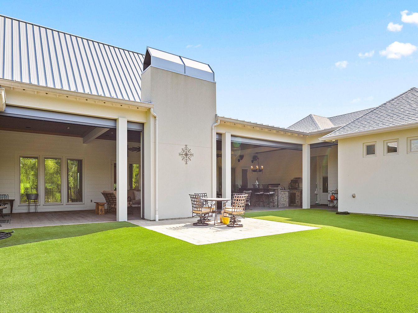This spacious outdoor patio area features a green artificial turf ground, providing a lush and vibrant look with minimal maintenance. The structure combines a mix of smooth cream-colored walls with contrasting white beams and a modern metal roof, creating a clean and fresh aesthetic. A centrally located beige chimney feature adds vertical interest and charm. On the patio, there is a small round metal table with two matching chairs, perfect for intimate seating. The surrounding covered spaces include visible indoor seating and a dining area beneath high ceilings with exposed beams. The design exudes an inviting, open-air ambiance, ideal for relaxation or social gatherings.