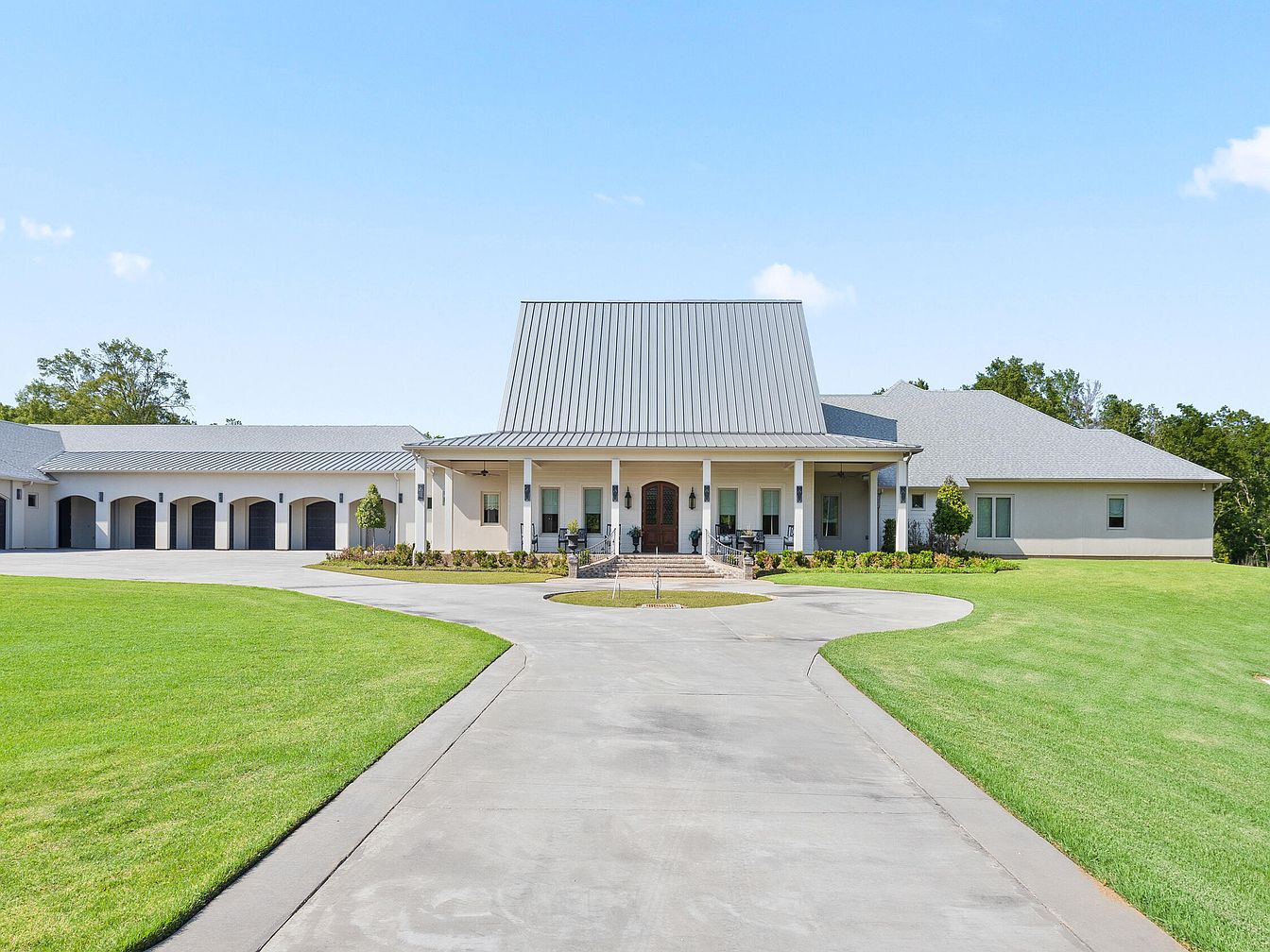 This stately home features a prominent metal roof complemented by pristine white exterior walls, blending modern and farmhouse style. The expansive circular driveway funnels visitors toward the main entrance and spacious garage area, which accommodates multiple vehicles with separate bays. A wide covered front porch with rocking chairs invites relaxation and overlooks lush, well-maintained lawns. The surrounding greenery provides privacy and a serene backdrop, emphasizing the home’s setting in a rural or semi-rural environment. The architectural design balances functionality with elegance, offering a welcoming and grand first impression.