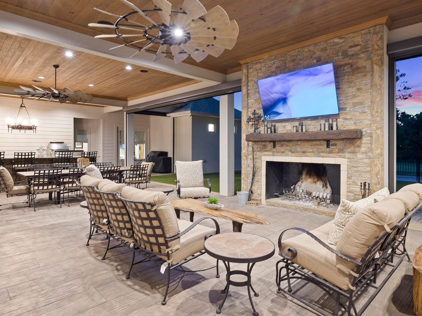 This covered outdoor living space offers a cozy and inviting atmosphere with earthy tones and natural materials. A stone fireplace with a rustic wooden mantel serves as the focal point, complemented by a flat-screen TV mounted above. Comfortable cushioned wrought iron seating surrounds a live-edge wooden coffee table, paired with a small round side table. The ceiling features warm wood panels and two large, uniquely designed ceiling fans resembling windmill blades for ventilation. Adjacent to the seating area is an outdoor dining set, also with wrought iron chairs. The open layout connects seamlessly with the lawn and neighboring structures, blending indoor comfort with outdoor openness.