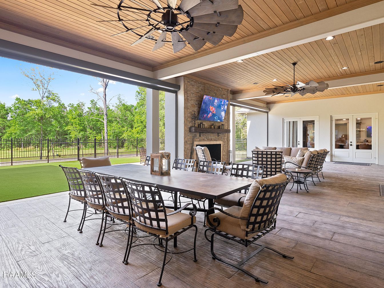 This spacious covered patio features a seamless blend of comfort and outdoor living. The ceiling is finished with warm wooden planks, adding a natural, inviting touch contrasted by modern metal ceiling fans styled to resemble windmills. The flooring mimics wood grain, continuing the rustic yet polished aesthetic. A large iron dining table with cushioned chairs sits centrally, perfect for gatherings, while a cozy seating area with plush cushions faces a stone fireplace mounted with a TV, creating a focal point. Neutral tones dominate, harmonizing with the lush green yard visible beyond the open sides, enclosed by a wrought iron fence.