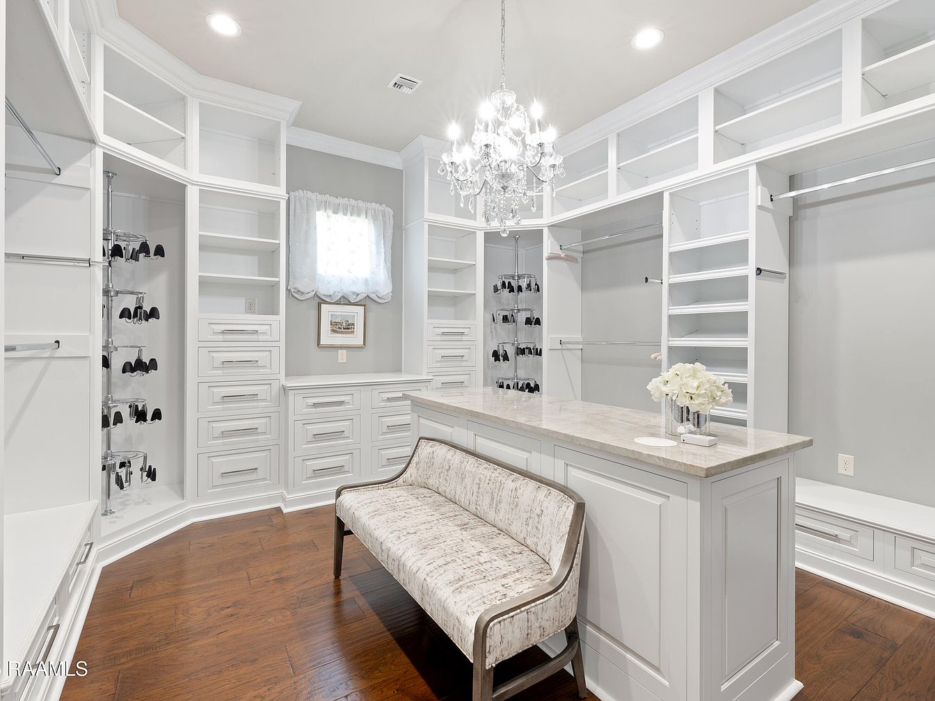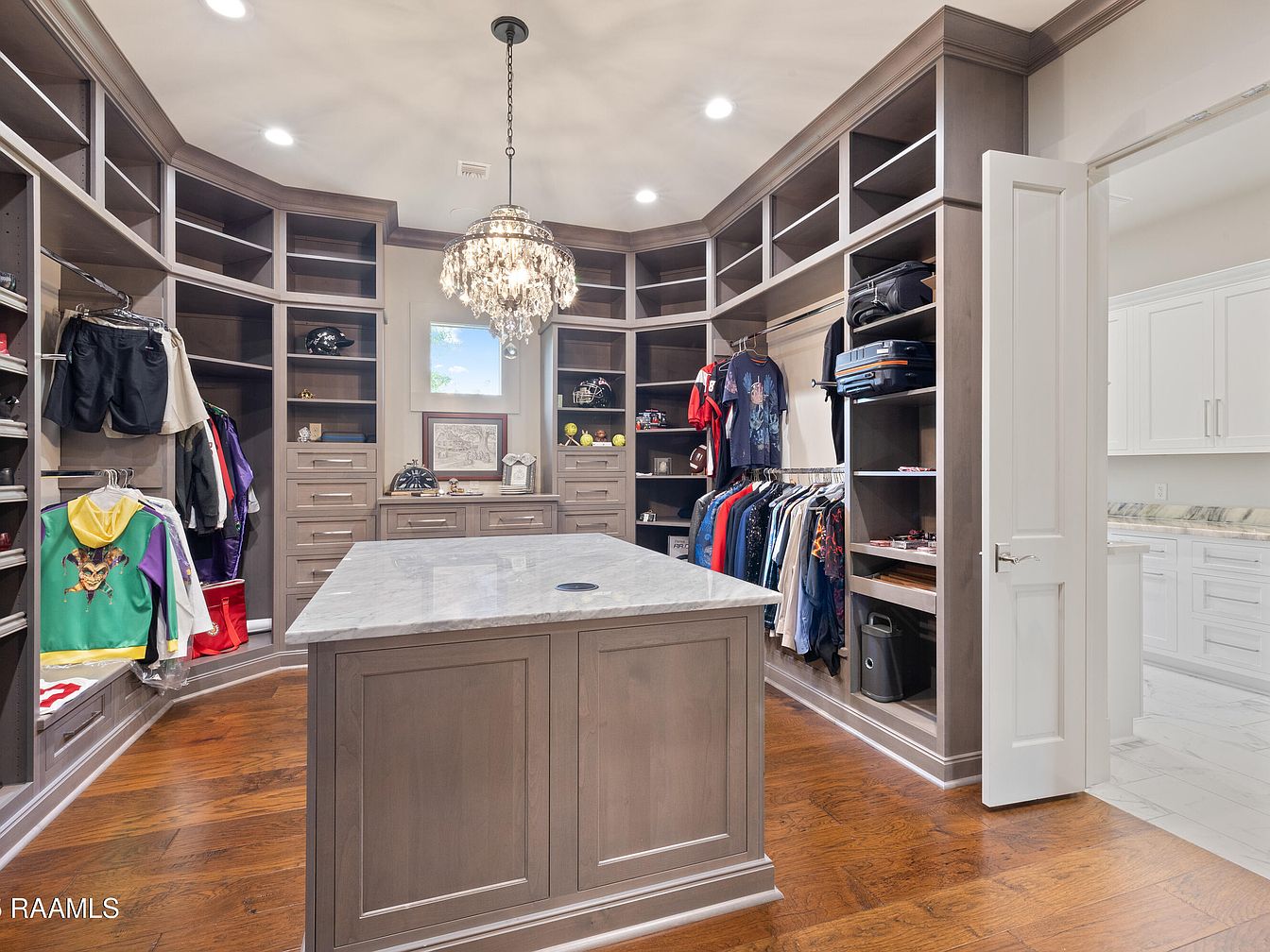 This expansive walk-in closet features a sophisticated blend of natural wood tones with soft gray cabinetry creating a warm, inviting atmosphere. Custom-built shelving and multiple hanging rods maximize storage, while the central island with a marble countertop offers additional space for organizing accessories or folding clothes. A crystal chandelier overhead adds an elegant touch and highlights the room’s refined architectural details, including crown molding and recessed lighting. The wooden floors enhance the overall cozy yet polished aesthetic. A small window invites natural light, balancing the space’s functional design with luxury.