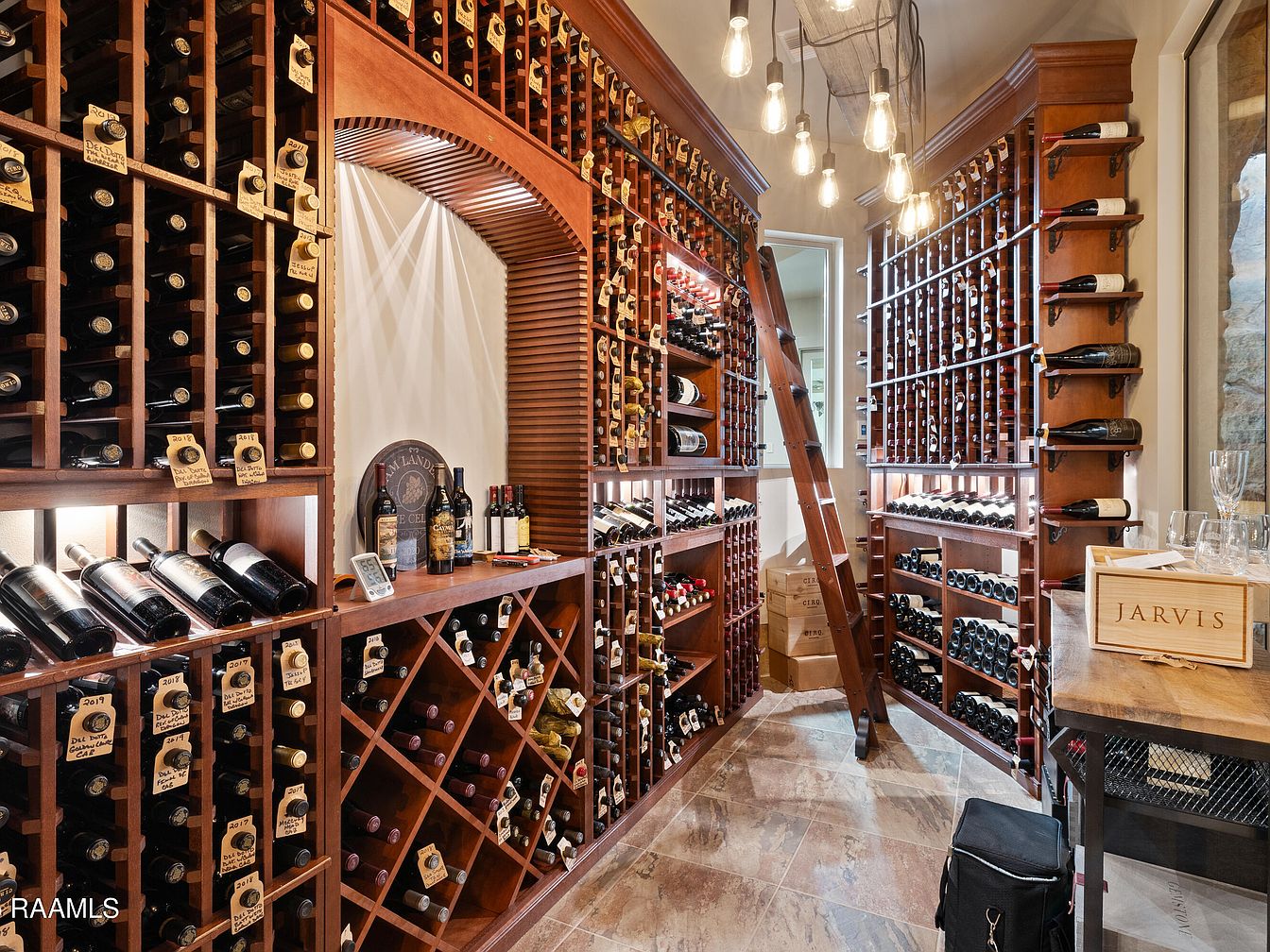 This elegant wine cellar showcases a sophisticated and functional design, featuring rich wooden wine racks that maximize vertical space and accommodate numerous bottles. The room is lined with floor-to-ceiling cherry wood cabinetry, with an integrated rolling ladder for easy access to higher shelves. A tasteful archway adds architectural character, while the warm wood tones contrast beautifully against the light, glossy stone flooring. The lighting is carefully designed with exposed filament bulbs hanging from the ceiling, casting a warm glow that highlights the meticulous organization of wines. A sturdy wooden table nearby holds glassware and wine crates, perfect for tasting and display.