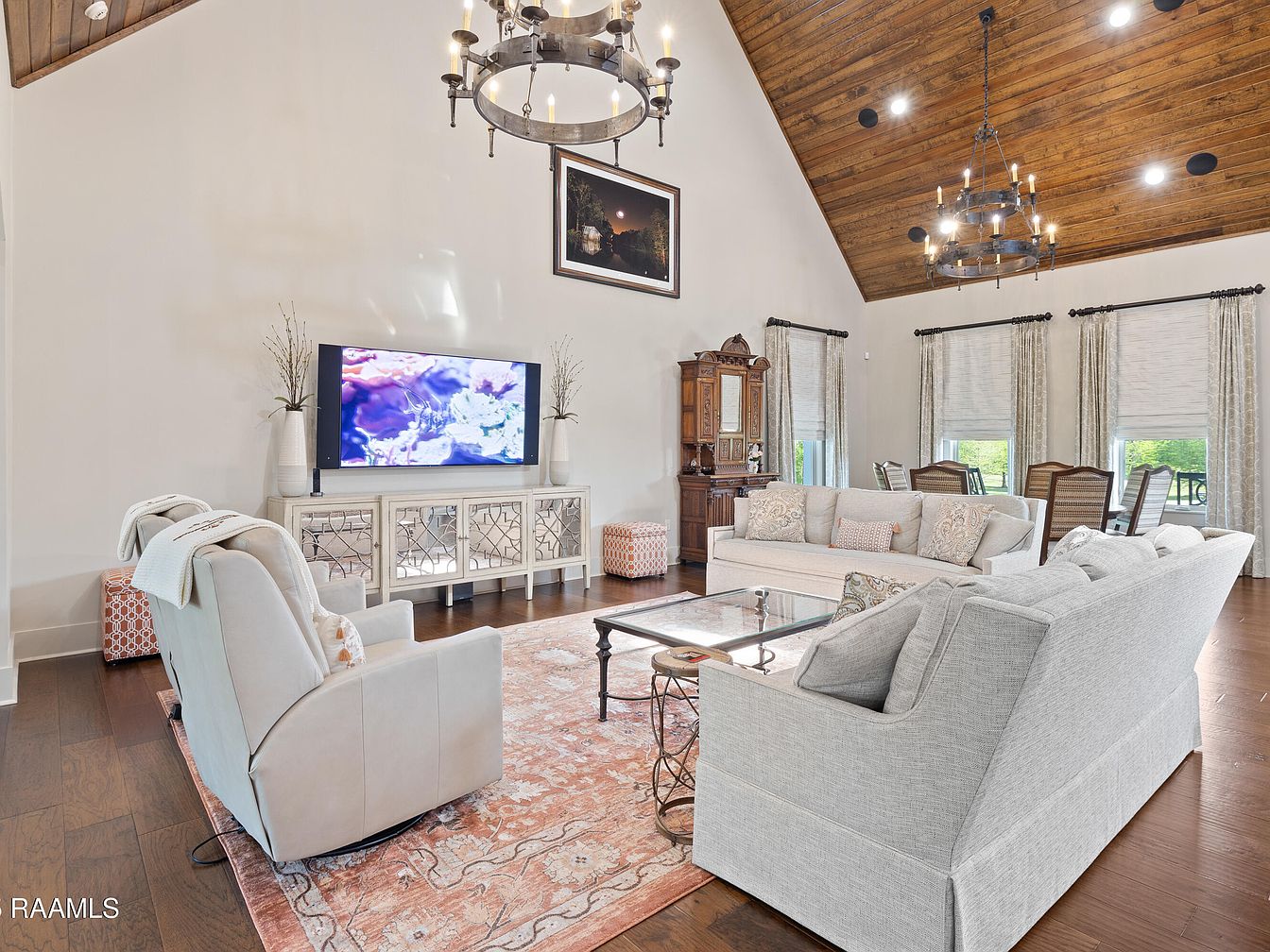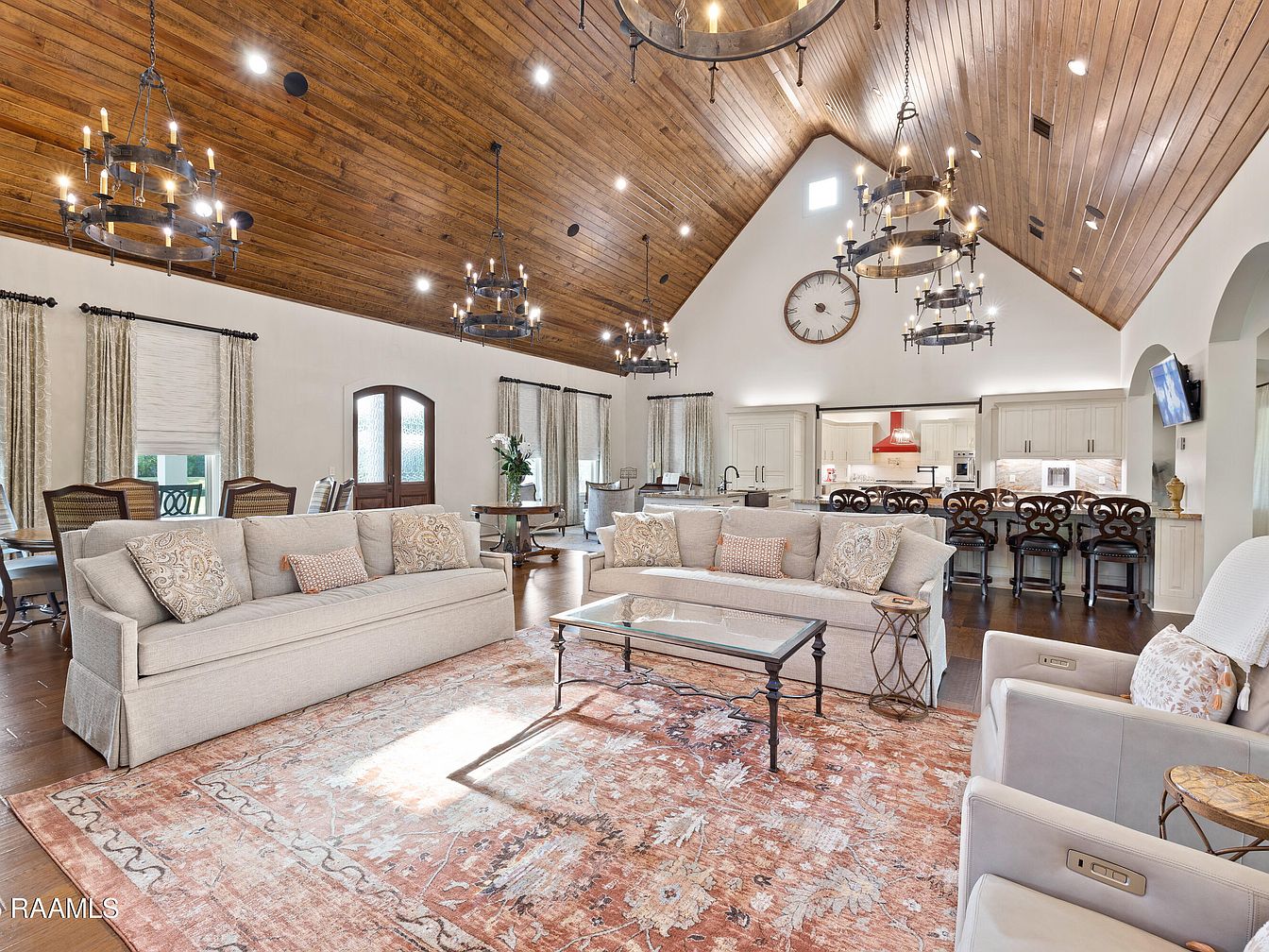 This spacious living area blends rustic charm with modern comfort, featuring a vaulted wood-paneled ceiling with multiple wrought iron chandeliers that add warmth and drama. The neutral-toned beige sofas are arranged around a glass-top coffee table atop a large, subtly patterned area rug in muted reds and earth tones, inviting relaxation. Large windows are adorned with elegant drapery, allowing natural light to enhance the soft, calming palette. At the far end, a kitchen with creamy white cabinetry and a striking red range hood opens through a wide archway, complemented by a breakfast bar with intricately carved wooden stools. Decorative touches like a large wall clock complete the cohesive, welcoming space.