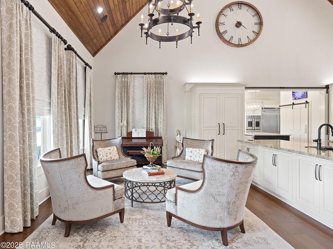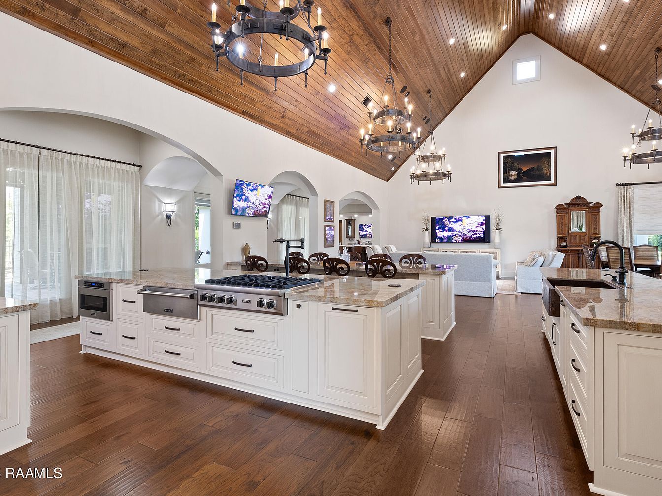 This spacious area combines a well-appointed kitchen and a cozy living room under a striking vaulted wood plank ceiling adorned with multiple wrought iron chandeliers. The kitchen features large white cabinetry with dark handles and granite countertops on expansive islands that provide ample workspace and seating with ornate dark wood barstools. Stainless steel appliances, including a gas stove and built-in microwave, integrate seamlessly into the cabinetry. The living area includes soft neutral sofas facing a mounted TV above a white console. Arched doorways, large windows with sheer curtains, and warm-toned hardwood floors complete the elegant, airy ambiance.