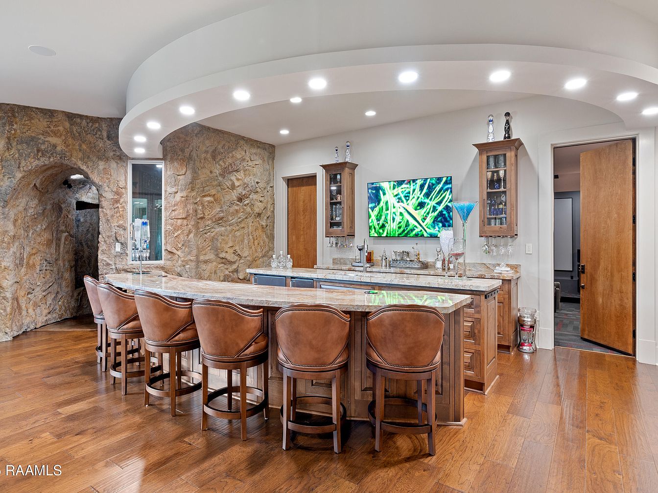 This sophisticated home bar features a large curved island with a polished marble countertop that invites social gatherings. Six plush, leather upholstered bar stools with nailhead trim line the counter, offering comfortable seating. The backdrop showcases custom wooden cabinetry with glass doors for showcasing glassware and spirits. Above the bar area, a recessed curved soffit with evenly spaced LED lights provides ample illumination. Unique to this space is a rustic rock wall with a cave-like passage, adding a natural and intriguing architectural element. Warm-toned hardwood flooring ties the space together, creating a cozy yet elegant ambiance.