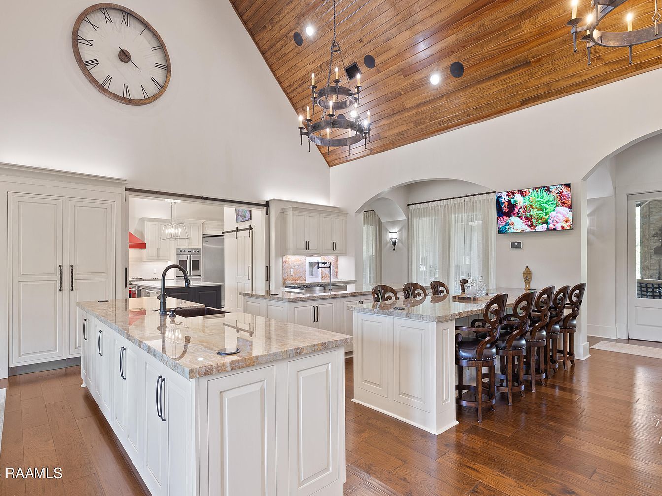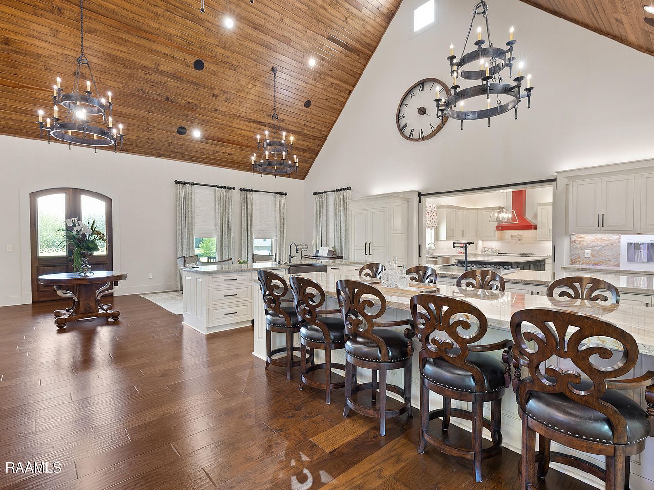 This spacious kitchen and dining bar area features a warm, inviting aesthetic highlighted by a vaulted wooden ceiling with rich wood tones that contrast beautifully with the white walls and cabinetry. The cabinetry is classic white with black handles, creating a crisp and clean look. A large island with a smooth, light-colored marble countertop serves as both a kitchen workspace and an elegant bar seating area with six ornately carved wooden chairs upholstered in black leather. The double wrought iron chandeliers add a rustic charm and charm. A large clock adorns the wall above, while tall windows with draped, light gray curtains allow natural light to brighten the space. Wood flooring in a deep, warm tone grounds the room, complementing both ceiling and chairs beautifully, while the adjacent kitchen area includes a red accent hood, adding a pop of vibrant color to the otherwise neutral palette.