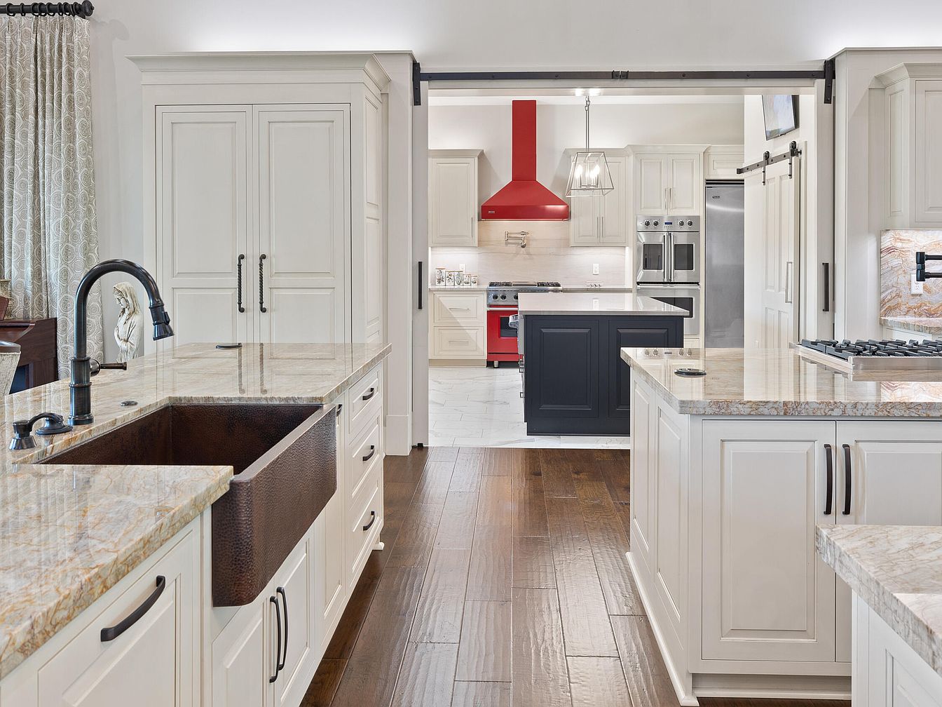 This kitchen features a spacious layout with a strong emphasis on both form and function. Cream-colored cabinetry dominates the space, paired beautifully with polished marble countertops that add a touch of luxury. The rich hardwood flooring provides warmth, complementing the neutral tones. A standout feature is the striking dark farmhouse sink with a sleek black faucet on the near island, enhancing its rustic charm. Through a wide doorway with a sliding barn door track, a secondary kitchen area reveals a bold red range hood and matching stove, injecting vibrant color against the pale cabinetry and a black island base, creating a modern yet cozy atmosphere.