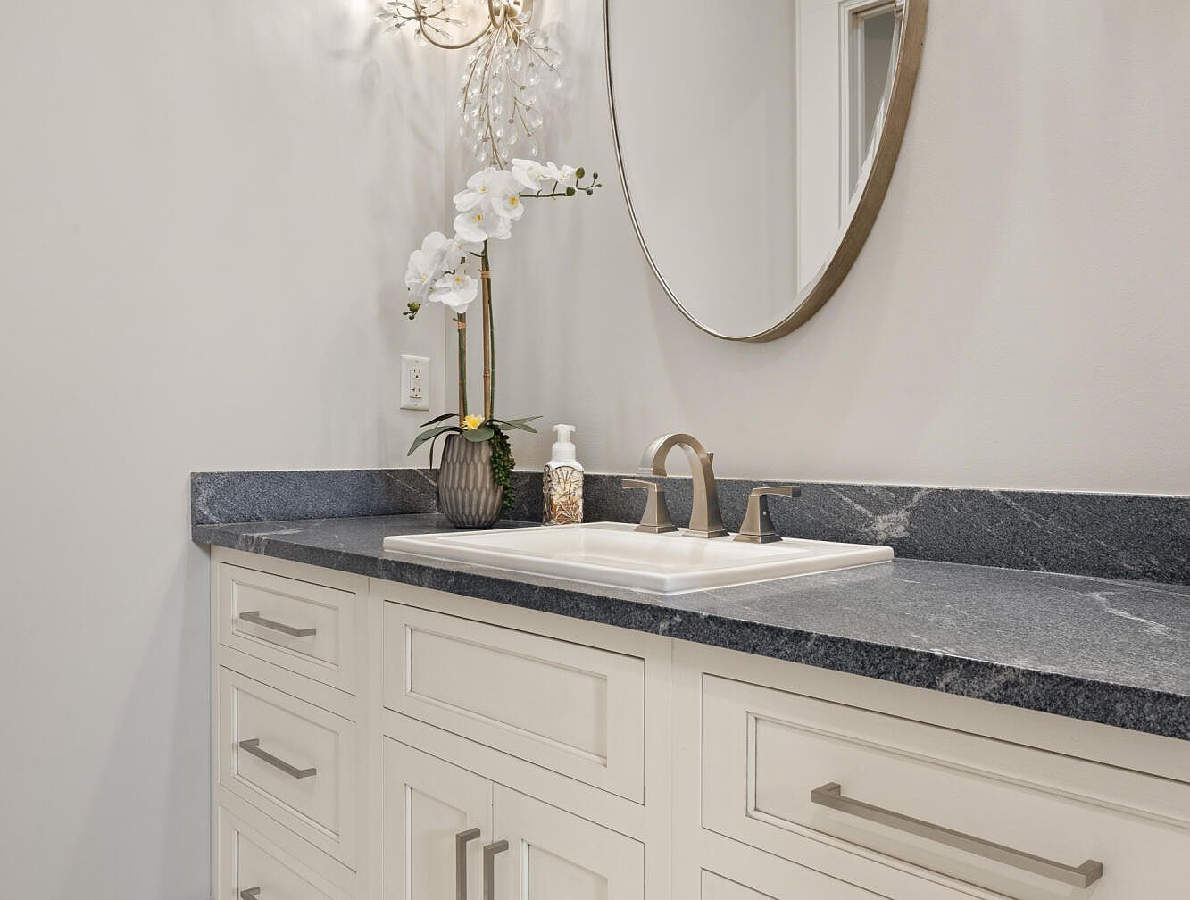 This bathroom vanity combines elegance and functionality with its sleek design. The countertop features a smooth, dark gray stone with subtle white veining, contrasting beautifully against the soft off-white cabinetry below. The cabinetry is detailed with recessed panels and modern brushed nickel handles, presenting a clean, timeless look. A rectangular white sink is centrally placed beneath a large round mirror framed in a thin wood or metal edge, adding a touch of warmth. Soft neutral walls complement the space, while a decorative vase holding delicate white orchids enhances the serene, spa-like ambiance. A stylish soap dispenser and a nearby electrical outlet emphasize practicality within this refined setup.