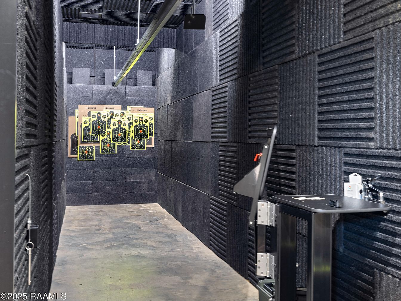 This long, narrow space is designed for precise firearm practice, featuring dark, soundproof foam panels covering the walls to dampen noise and ensure safety. A sturdy, industrial-style shooting bench is positioned to the right, providing a stable platform for firearms and equipment. Multiple paper target sheets displaying human silhouettes hang at the far end, suspended from a rail system that allows easy target adjustment. The concrete floor enhances durability and practicality. The overall aesthetic is utilitarian and functional, prioritizing safety, acoustics, and efficiency, with a professional, no-frills design approach.