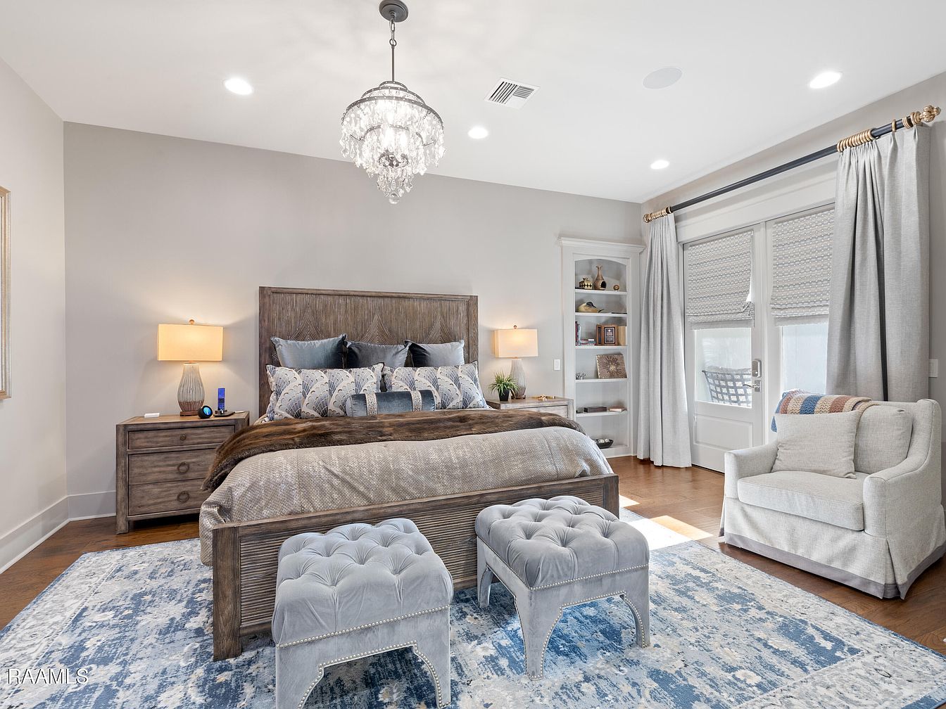 This master bedroom combines elegance with cozy comfort, featuring a muted color palette centered around soft greys, natural wood tones, and hints of blue. The centerpiece is a sturdy wood bed with a high headboard, adorned with a variety of plush pillows and a warm fur throw. Flanking the bed, two matching nightstands hold lamps emitting a gentle glow. On the floor, a large, patterned area rug in shades of blue and cream anchors the space. Near the window, an upholstered armchair offers a quiet retreat, complemented by tailored curtains and roman shades. A crystal chandelier overhead adds a touch of glamour, while built-in shelving in a corner displays decorative and functional items, enhancing the room’s tailored yet inviting aesthetic.