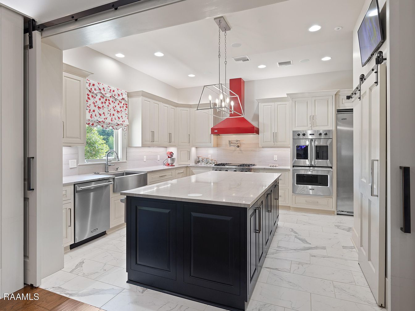 This spacious kitchen features a bright, open layout with a large central island finished in matte black cabinetry topped with sleek white marble. Surrounding the island, soft cream-colored cabinets provide ample storage, complementing the light gray marble tile flooring. The kitchen’s standout feature is a bold red range hood above a stainless-steel stove and double oven, adding a dramatic pop of color that contrasts beautifully with the otherwise neutral palette. Stainless steel appliances, including a dishwasher and refrigerator, enhance the modern aesthetic. A window above the farmhouse-style sink is dressed with a floral valance, infusing a subtle touch of charm and warmth.