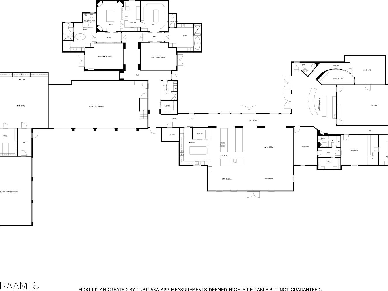 This expansive floor plan reveals a sprawling single-level home layout balancing private suites and communal spaces. The design features his and her primary suites each equipped with walk-in closets and adjoining baths, positioned symmetrically toward the upper part of the plan. Centrally located is a large everyday garage with easy access to an adjacent pantry and kitchen, which flows openly into a combined sitting, dining, and living area. Additional amenities include a wet bar adjacent to a man cave, a dedicated theater, wine cellar with wine cave, office space, and multiple bedrooms with en-suite bathrooms. The layout provides clear circulation through halls and galleries, emphasizing spacious, functional luxury living with defined zones for relaxation, entertainment, and work.
