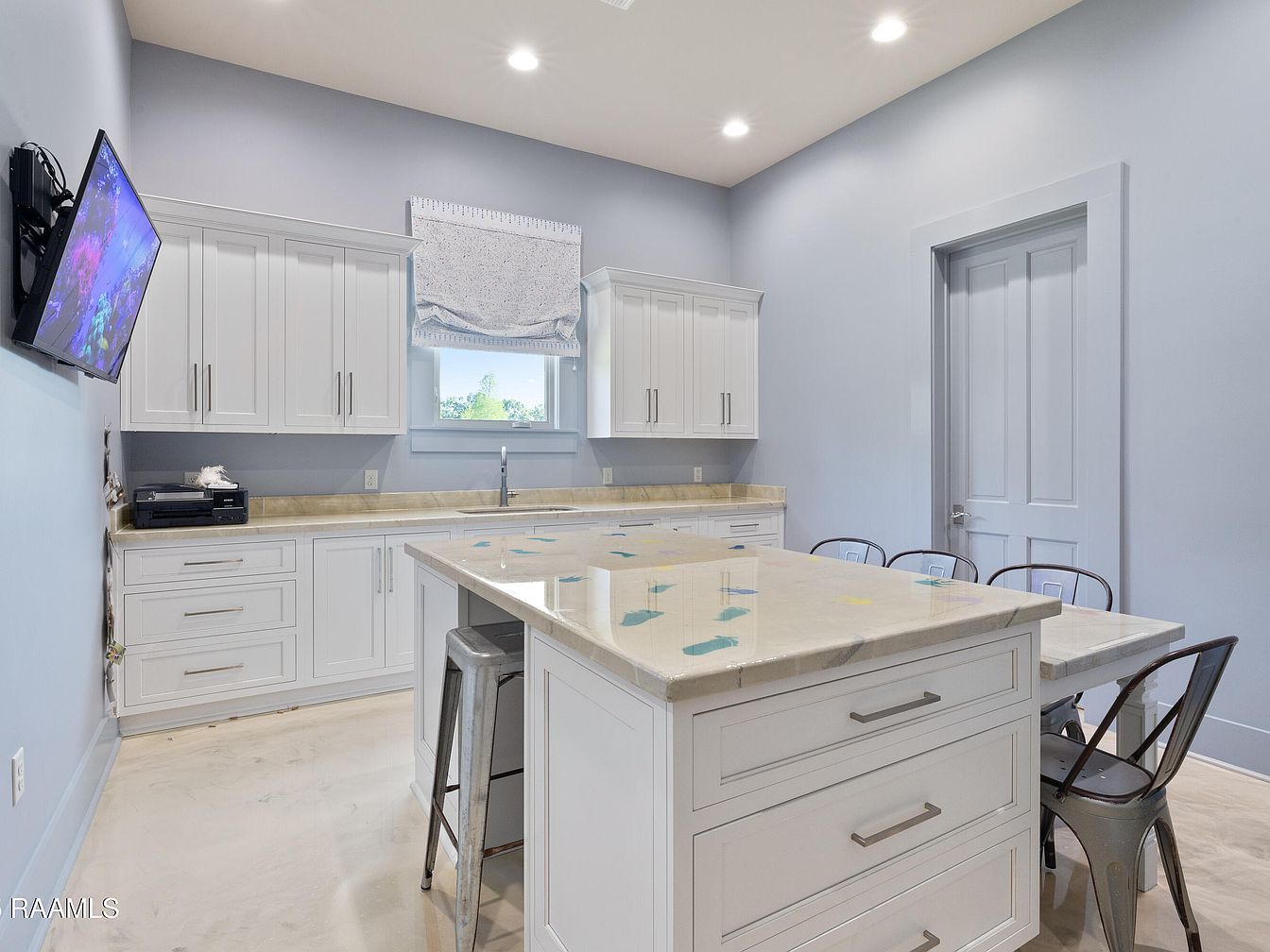 This kitchen space features a soft gray color palette for the walls, complemented by bright white cabinetry with classic panel details and sleek silver hardware. The focal point is a large kitchen island with a glossy beige countertop adorned with subtle blue and yellow patterns, providing both storage and seating with industrial-style metal stools. Above the sink, a window dressed with a simple white roman shade allows natural light to illuminate the clean, uncluttered countertops. The modern yet cozy ambiance is enhanced by recessed ceiling lights, a mounted flat-screen TV, and a polished concrete floor, highlighting a blend of contemporary and functional design.