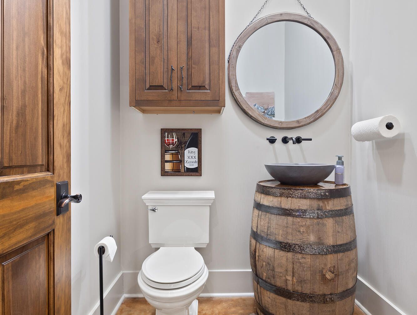 This compact powder room features a rustic, yet refined aesthetic with a reclaimed wooden barrel repurposed as a vanity supporting a sleek, modern vessel sink in matte black. Above the sink, a large round mirror with a natural wood frame hangs, adding warmth and a sense of space to the room. The walls are painted a soft, neutral shade that complements the warm tones of the wooden door and cabinetry above the toilet, which provide practical storage. Black hardware accents, including the wall-mounted faucet and toilet paper holders, contrast elegantly with the light walls and white porcelain toilet, balancing rustic charm with modern functionality.