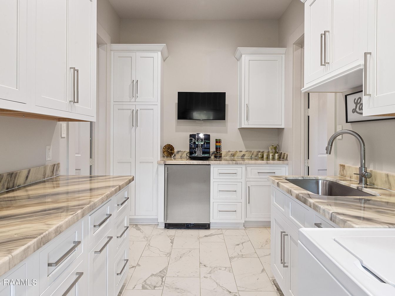 This narrow butler’s pantry space extends with white cabinetry, creating a clean and organized atmosphere. The countertops are striking with a polished, multi-toned marble featuring earthy beige, gray, and cream veining, harmonizing with the overall neutral palette. The floor is tiled in a white marble pattern, adding texture and luxury. Stainless steel accents include the under-counter fridge and sleek cabinet handles, while a mounted flat-screen TV and a modern espresso machine add convenience and style. The room’s lighting and light-toned walls enhance the brightness, turning this functional space into an elegant transition area between kitchen and dining.