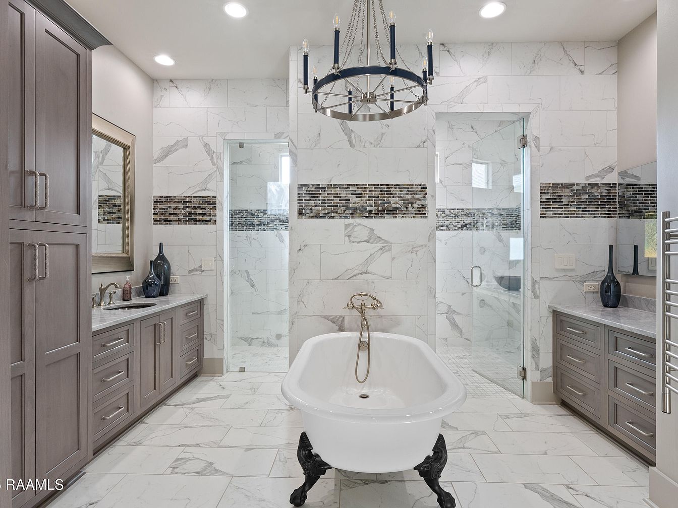 This elegant bathroom centers around a classic white clawfoot tub with black ornate feet, positioned prominently in the middle. Surrounding walls and floors are clad in white marble tiles accented with subtle gray veining, complemented by a decorative horizontal band of mosaic tiles in earth tones and dark shades that adds texture and contrast. To the left and right are matching gray-toned vanities and cabinetry providing ample storage and topped with marble countertops. Two framed mirrors hang above the sinks, reflecting light and space. The room’s ambiance is enhanced by a striking circular chandelier with candle-style bulbs, lending an upscale, sophisticated feel.