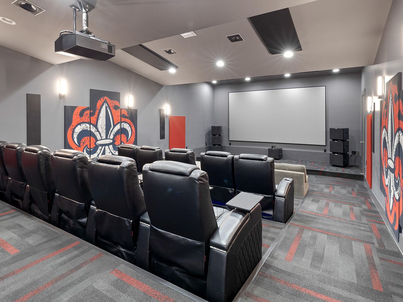 This dedicated home theater room features a tiered seating arrangement with rows of black leather recliner chairs designed for optimal comfort and viewing. The walls and ceiling are painted in a muted gray tone, enhancing the cinematic atmosphere, while the carpet incorporates a stylish geometric pattern in gray with bold red accents to add vibrancy. The front wall showcases a large, flat projection screen flanked by high-quality speakers. Modern wall sconces provide subtle, ambient lighting. Decorative panels with a striking red and white fleur-de-lis design on a black background add a distinctive and cohesive artistic touch to the space.