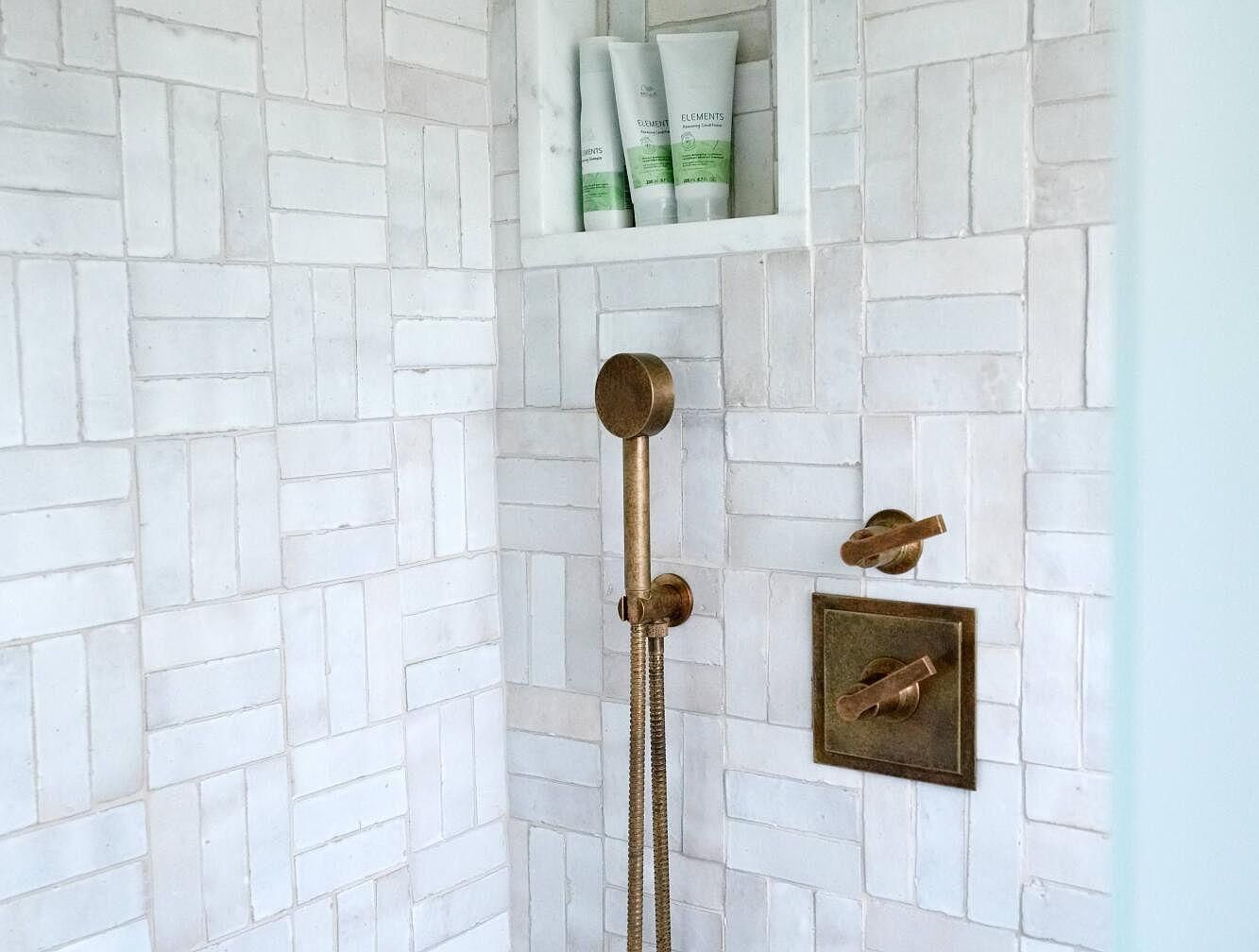 This shower corner highlights a thoughtfully designed niche embedded into a wall tiled with white, rectangular subway tiles arranged in a varied brick pattern. The tiles have a slight texture and subtle tonal variations, adding depth and dimension to the predominantly white space. Above the bronze-colored, vintage-style fixture set, the niche comfortably holds three green and white tubes, likely of shower products. The bronze shower controls and handheld showerhead introduce a warm, metallic contrast, enhancing the space with a touch of rustic elegance. The layout balances functionality and tasteful aesthetics within a compact, refined shower area.
