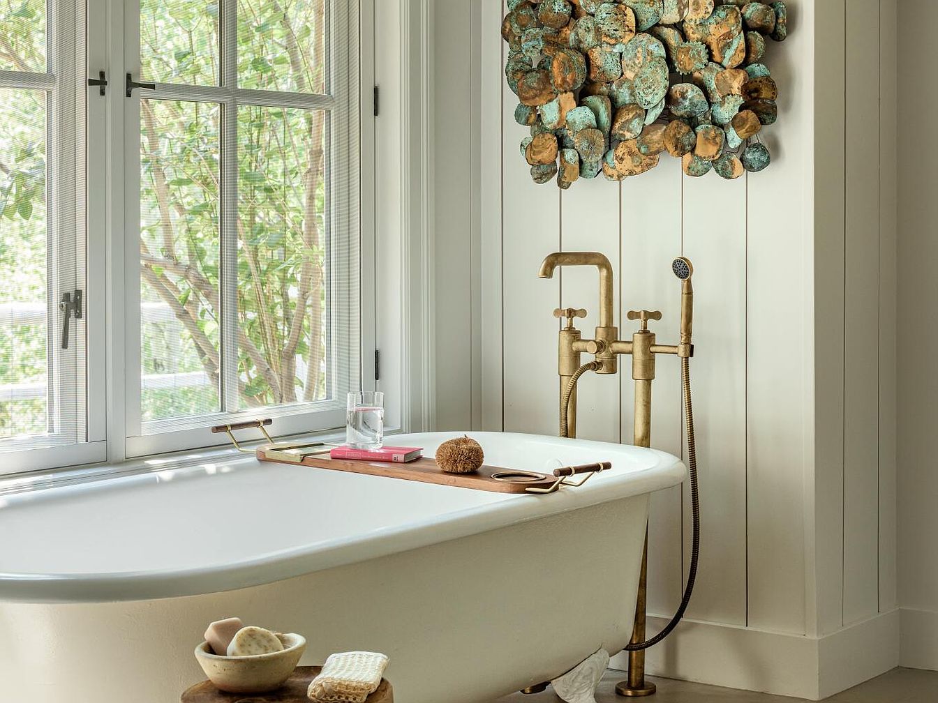 This serene bathroom corner features a classic white clawfoot bathtub positioned beneath a large multi-pane window that invites natural light and a lush green view inside. The walls are adorned with vertical white shiplap paneling, enhancing a clean and airy feel. A striking piece of wall art with rustic bronze and teal hues and organic shapes adds texture and visual interest above the vintage-style brushed brass faucet, complete with a handheld shower attachment. A wooden bath tray rests on the tub, holding a glass of water, a book, and a bath brush, conveying a peaceful, spa-like atmosphere. Nearby, a small wooden stool displays personal bath items, emphasizing a warm, inviting, and thoughtfully curated bathing space.